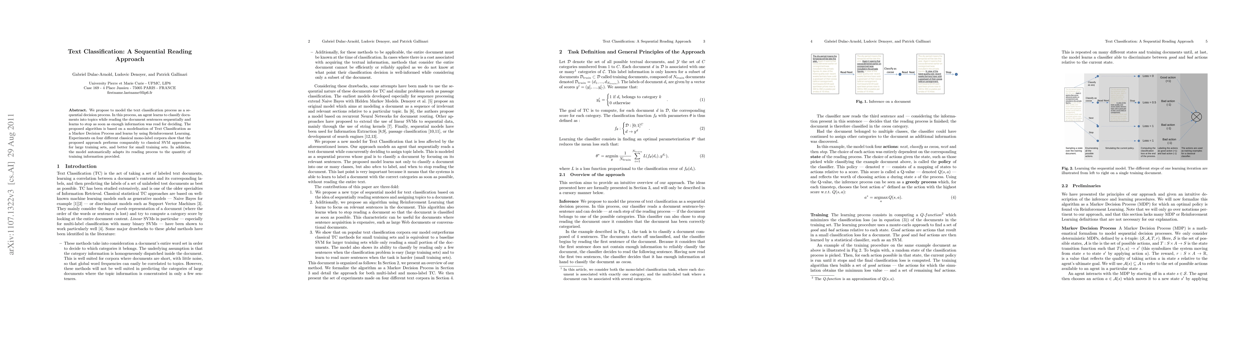 This paper proposes a sequential decision-making approach for text classification based on a Markov Decision Process and Reinforcement Learning. The method reads documents sentence by sentence and stops when sufficient information is gathered for classification, showing better performance for small training sets compared to classical SVM methods.