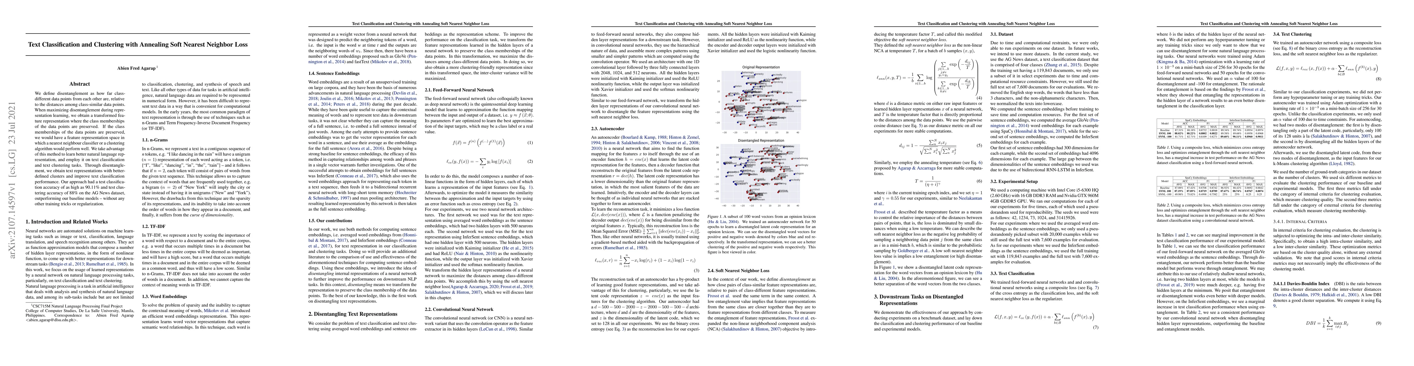 We define disentanglement as how far class-different data points from each other are, relative to the distances among class-similar data points. When maximizing disentanglement during representation learning, we obtain a transformed feature representation where the class memberships of the data points are preserved. If the class memberships of the data points are preserved, we would have a feature representation space in which a nearest neighbour classifier or a clustering algorithm would perform well. We take advantage of this method to learn better natural language representation, and employ it on text classification and text clustering tasks. Through disentanglement, we obtain text representations with better-defined clusters and improve text classification performance. Our approach had a test classification accuracy of as high as 90.11% and test clustering accuracy of 88% on the AG News dataset, outperforming our baseline models -- without any other training tricks or regularization.