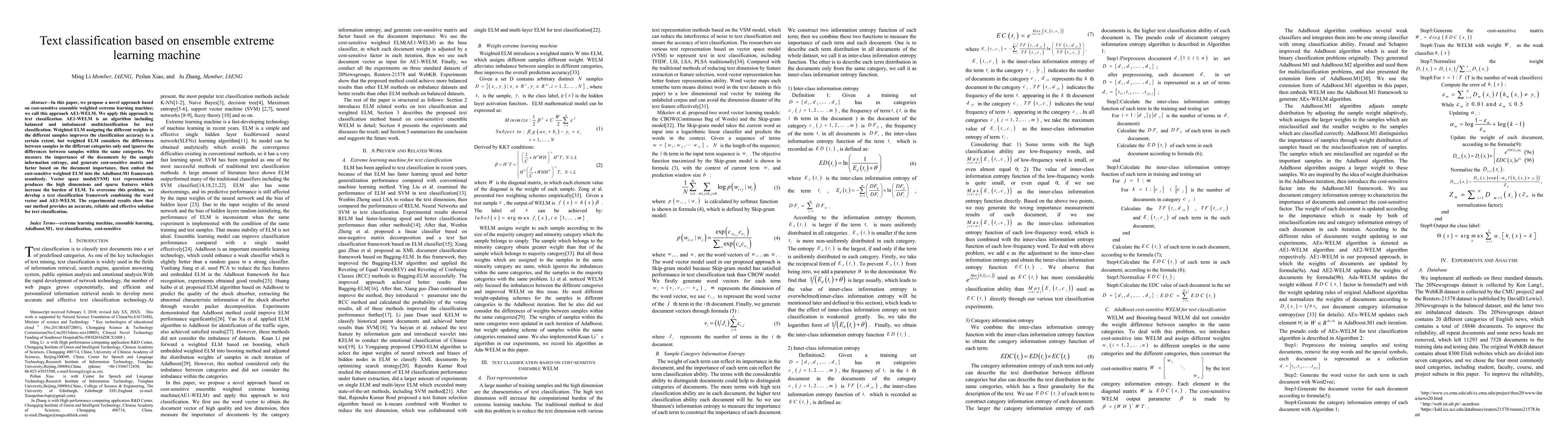 The paper introduces AE1-WELM, an ensemble weighted extreme learning machine for text classification, which integrates cost-sensitive factors and document category information entropy into the AdaBoost.M1 framework.