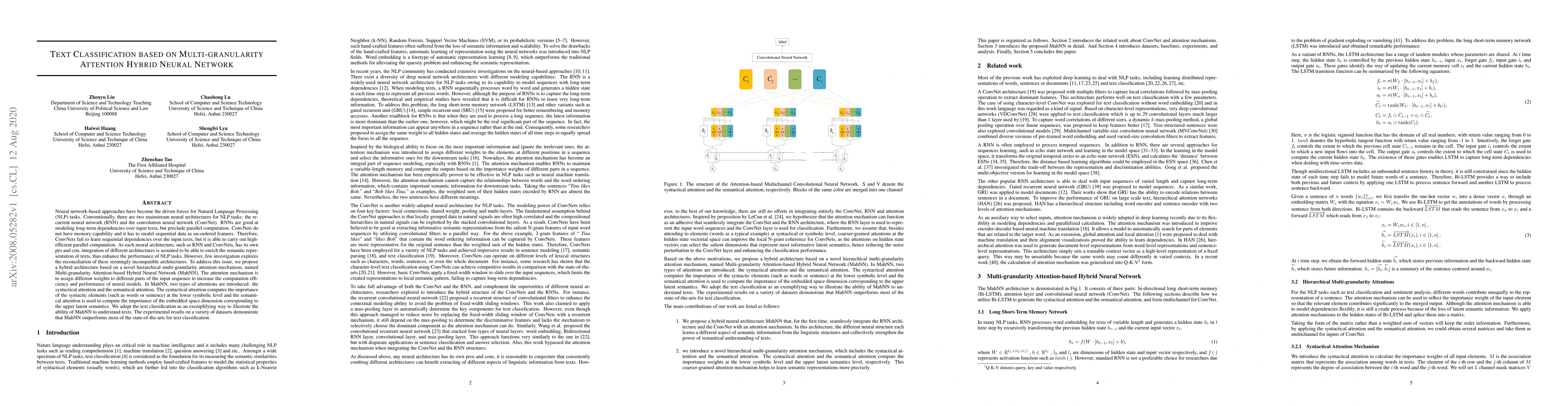 This paper proposes a hybrid neural network, named Multi-granularity Attention-based Hybrid Neural Network (MahNN), that integrates both recurrent neural networks (RNN) and convolutional neural networks (ConvNet) to enhance text classification performance. The hybrid model employs a hierarchical multi-granularity attention mechanism to improve computational efficiency and semantic representation.