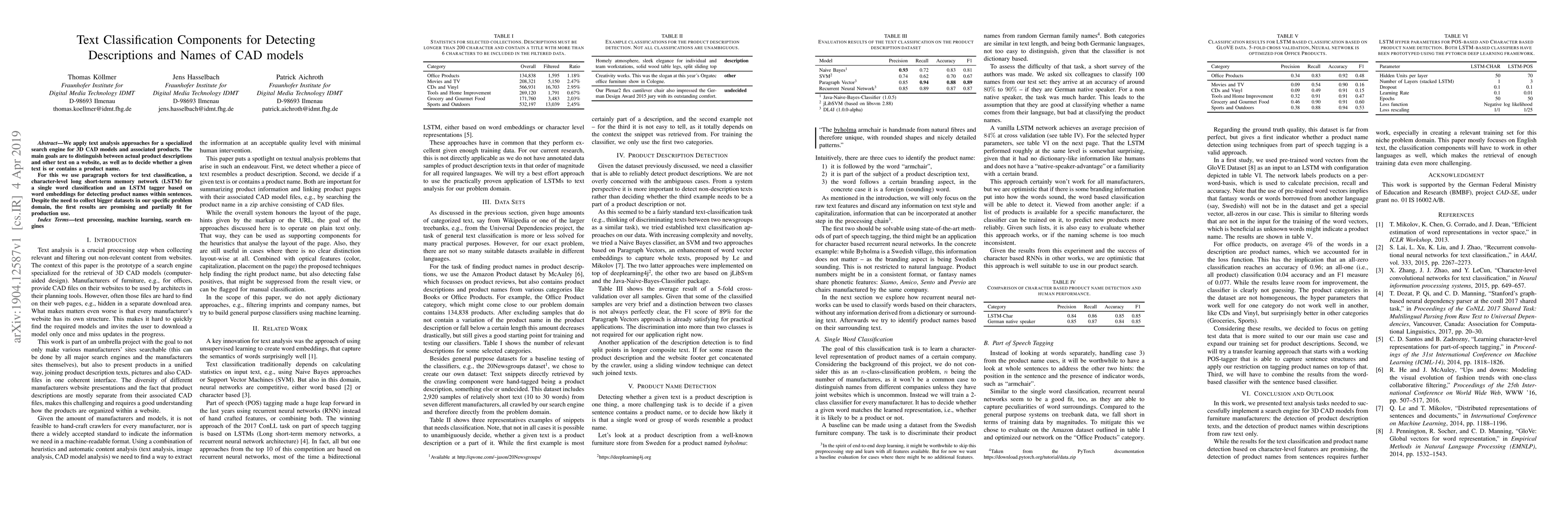 This paper explores text classification methods to distinguish product descriptions and names in 3D CAD model searches, employing paragraph vectors, character-level LSTMs, and an LSTM tagger based on word embeddings. Initial results are promising and partially ready for production use, though larger datasets are still needed.