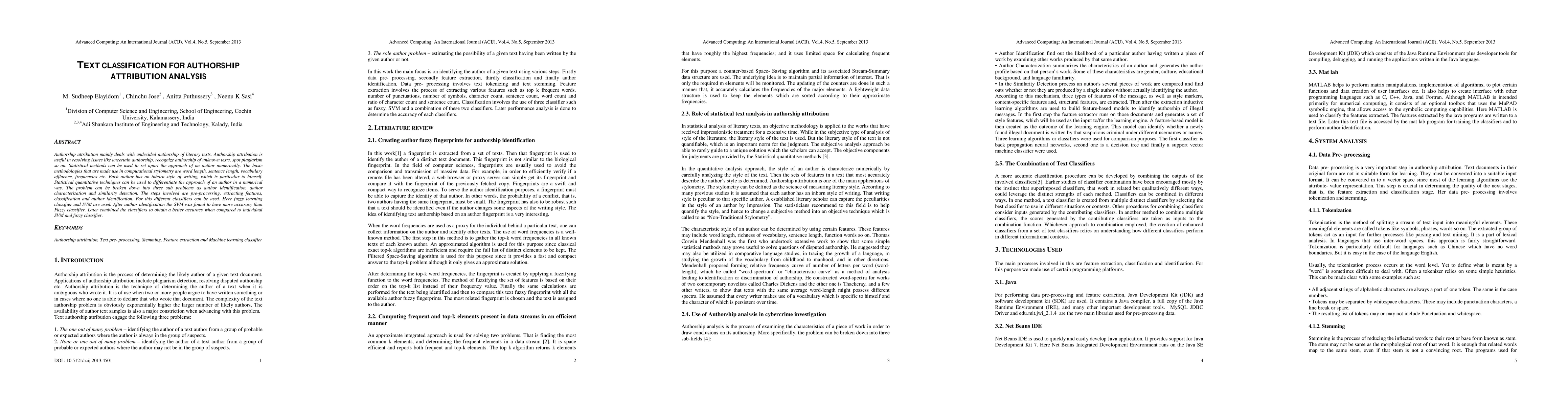 This paper explores authorship attribution through text classification, employing statistical methods to distinguish authors based on features like word and sentence length. It compares the performance of SVM and fuzzy learning classifiers, finding that combined classifiers yield higher accuracy than individual methods.