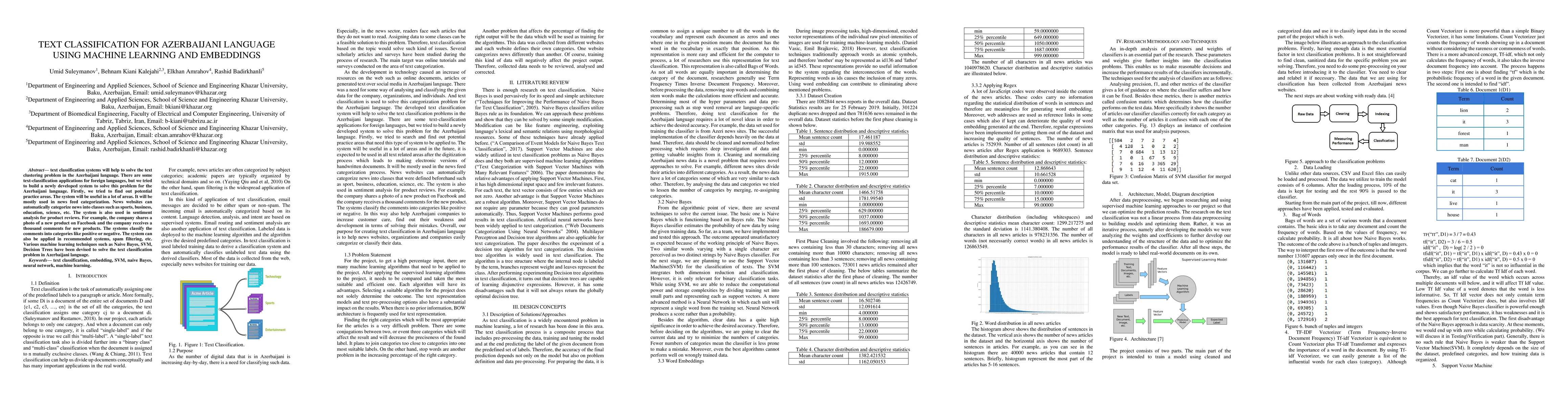This paper develops a machine learning-based text classification system for the Azerbaijani language, aiming to categorize news and product reviews. It employs techniques like Naive Bayes, SVM, and Decision Trees to address various practical applications, including news feed categorization, sentiment analysis, and spam filtering.
