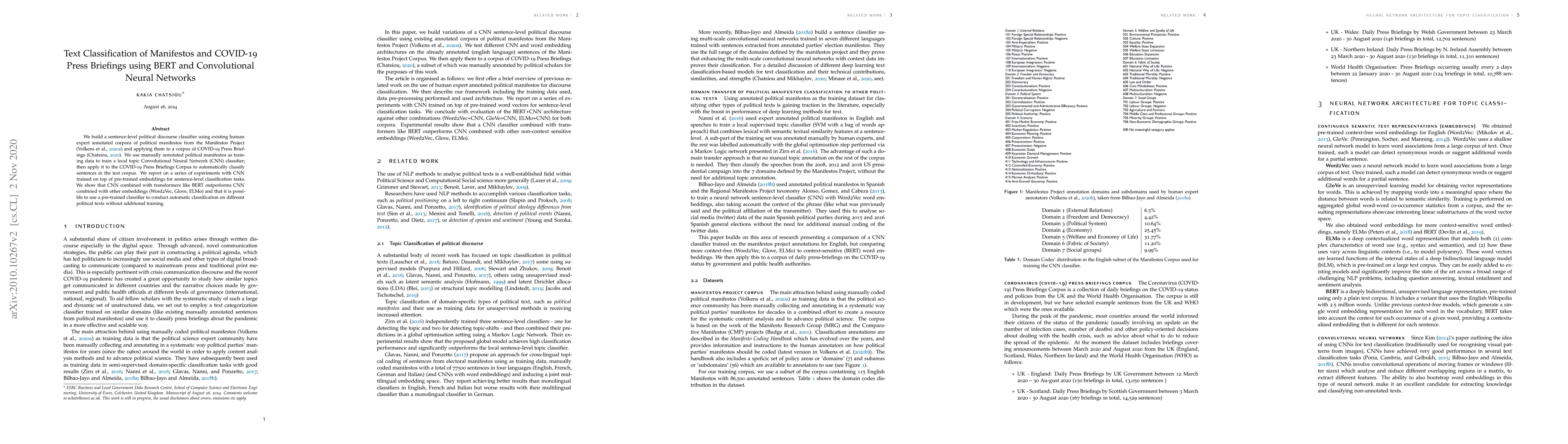 Researchers used BERT and Convolutional Neural Networks to classify COVID-19 press briefings and political manifestos, finding that CNN with pre-trained BERT embeddings outperformed other combinations.