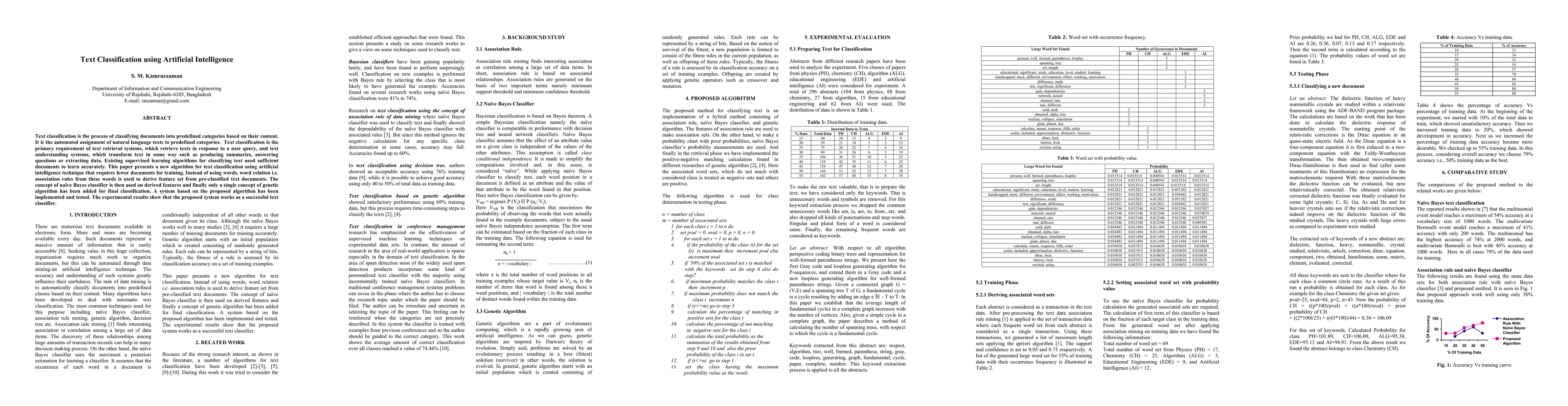 Text classification is the process of classifying documents into predefined categories based on their content. It is the automated assignment of natural language texts to predefined categories. Text classification is the primary requirement of text retrieval systems, which retrieve texts in response to a user query, and text understanding systems, which transform text in some way such as producing summaries, answering questions or extracting data. Existing supervised learning algorithms for classifying text need sufficient documents to learn accurately. This paper presents a new algorithm for text classification using artificial intelligence technique that requires fewer documents for training. Instead of using words, word relation i.e. association rules from these words is used to derive feature set from pre-classified text documents. The concept of na\"ive Bayes classifier is then used on derived features and finally only a single concept of genetic algorithm has been added for final classification. A system based on the proposed algorithm has been implemented and tested. The experimental results show that the proposed system works as a successful text classifier.