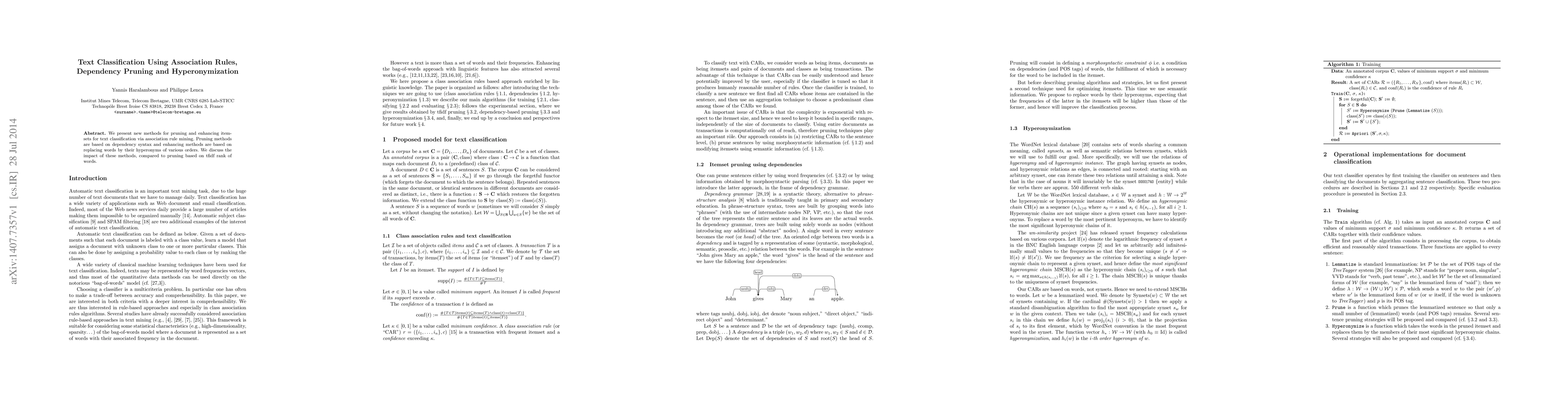 This paper introduces novel techniques for text classification that utilize association rule mining, dependency pruning, and hyponymy replacement to refine item sets. The study evaluates the effectiveness of these methods against traditional tf-idf-based pruning.