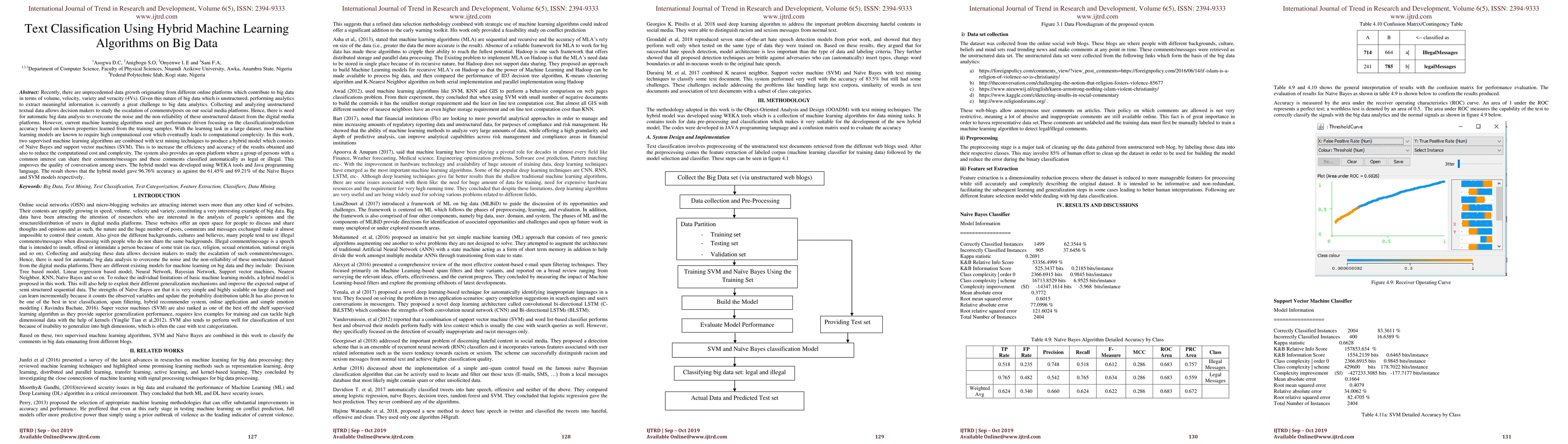 A hybrid machine learning model combining Naive Bayes and SVM improves text classification accuracy to 96.76% on unstructured big data, reducing computational complexity.