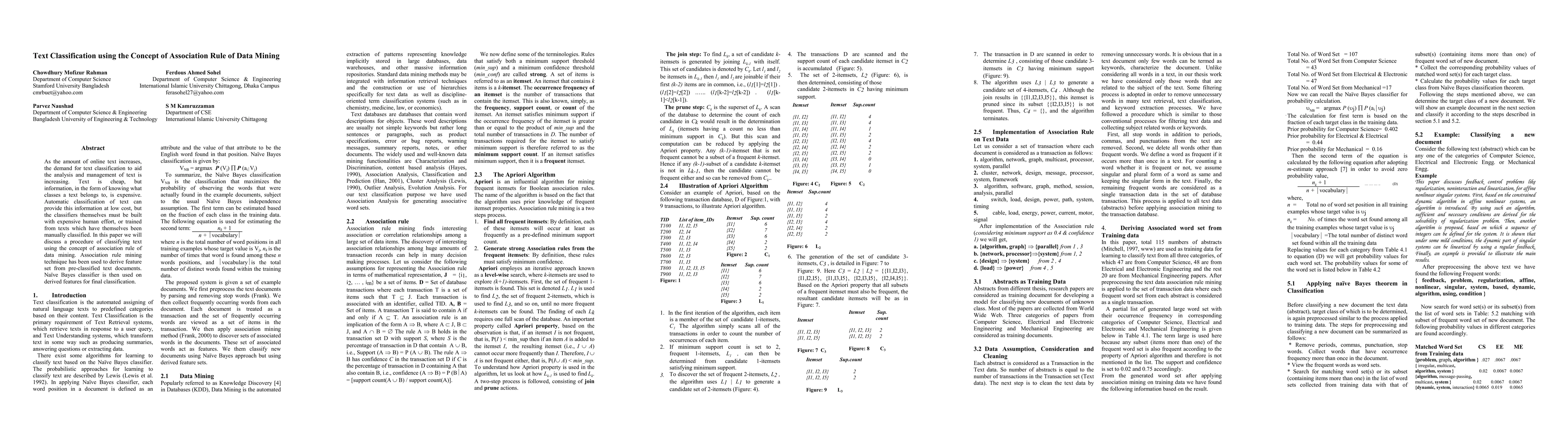 This paper proposes a text classification method using association rule mining to derive feature sets from pre-classified text documents, followed by the application of a Naive Bayes classifier for final categorization. The approach aims to reduce the human effort required in building traditional classifiers.