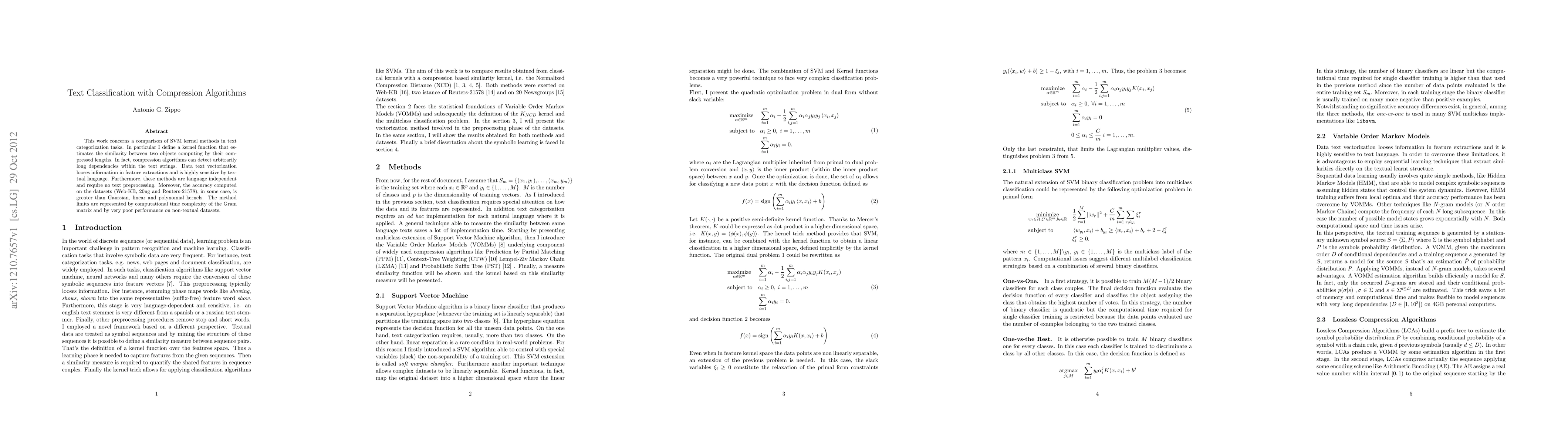 A new text classification method uses compression algorithms to compare similarity between text objects, outperforming traditional kernel methods in some cases.
