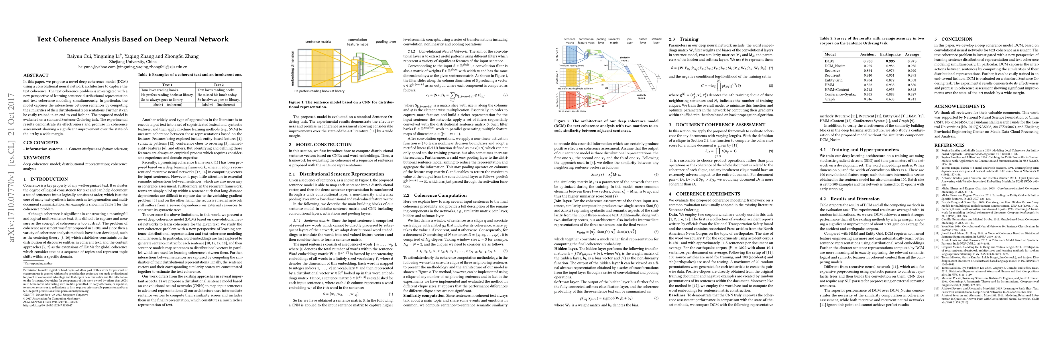 In this paper, we propose a novel deep coherence model (DCM) using a convolutional neural network architecture to capture the text coherence. The text coherence problem is investigated with a new perspective of learning sentence distributional representation and text coherence modeling simultaneously. In particular, the model captures the interactions between sentences by computing the similarities of their distributional representations. Further, it can be easily trained in an end-to-end fashion. The proposed model is evaluated on a standard Sentence Ordering task. The experimental results demonstrate its effectiveness and promise in coherence assessment showing a significant improvement over the state-of-the-art by a wide margin.