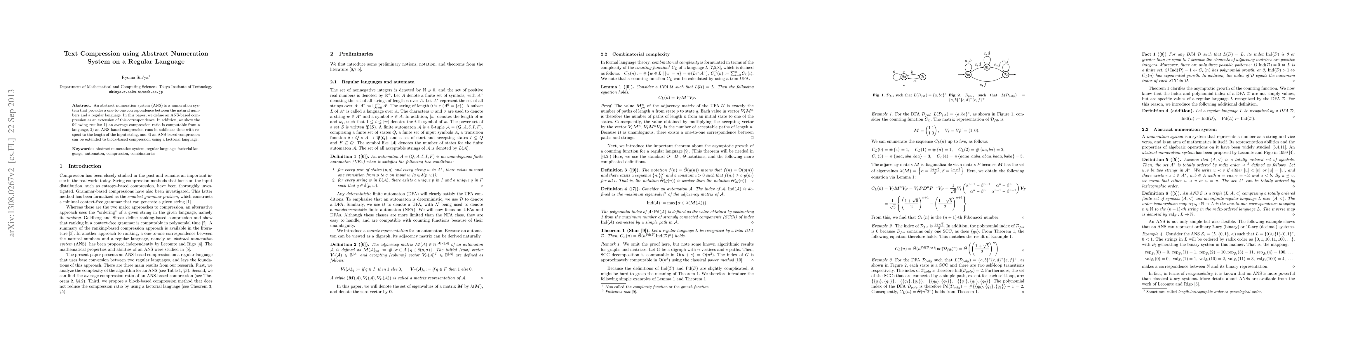 This paper introduces an abstract numeration system (ANS) for text compression on regular languages, demonstrating an average compression ratio, sublinear time complexity, and an extension to block-based compression using factorial languages.