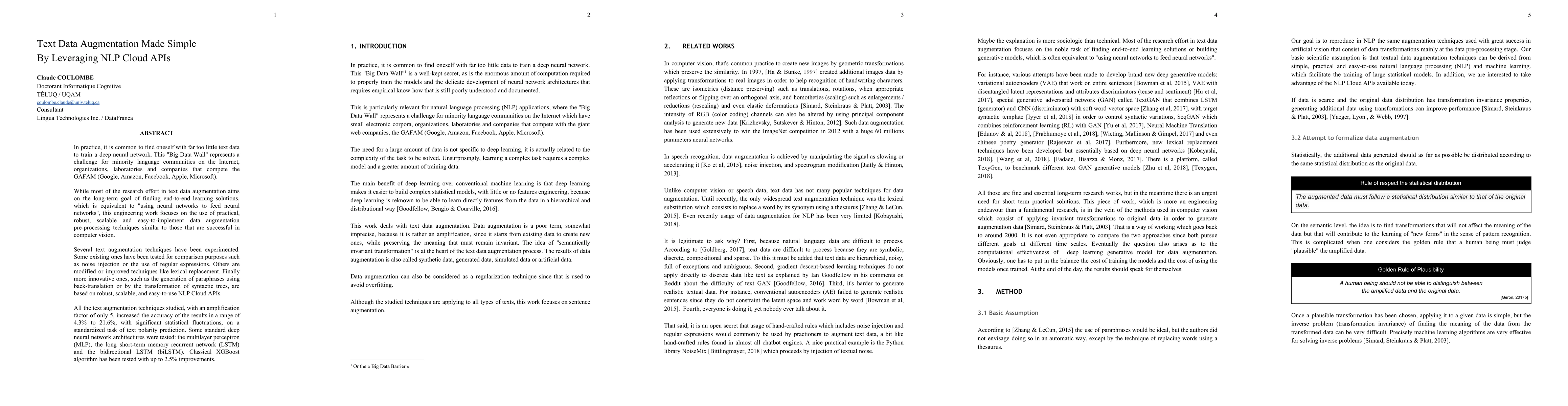 In practice, it is common to find oneself with far too little text data to train a deep neural network. This "Big Data Wall" represents a challenge for minority language communities on the Internet, organizations, laboratories and companies that compete the GAFAM (Google, Amazon, Facebook, Apple, Microsoft). While most of the research effort in text data augmentation aims on the long-term goal of finding end-to-end learning solutions, which is equivalent to "using neural networks to feed neural networks", this engineering work focuses on the use of practical, robust, scalable and easy-to-implement data augmentation pre-processing techniques similar to those that are successful in computer vision. Several text augmentation techniques have been experimented. Some existing ones have been tested for comparison purposes such as noise injection or the use of regular expressions. Others are modified or improved techniques like lexical replacement. Finally more innovative ones, such as the generation of paraphrases using back-translation or by the transformation of syntactic trees, are based on robust, scalable, and easy-to-use NLP Cloud APIs. All the text augmentation techniques studied, with an amplification factor of only 5, increased the accuracy of the results in a range of 4.3% to 21.6%, with significant statistical fluctuations, on a standardized task of text polarity prediction. Some standard deep neural network architectures were tested: the multilayer perceptron (MLP), the long short-term memory recurrent network (LSTM) and the bidirectional LSTM (biLSTM). Classical XGBoost algorithm has been tested with up to 2.5% improvements.