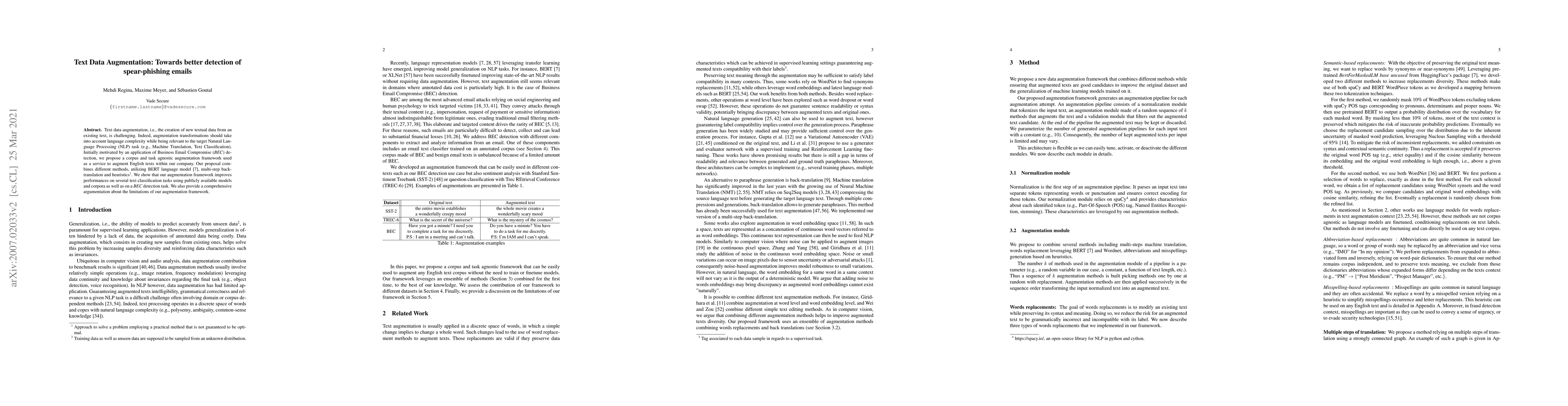 This paper proposes a text data augmentation framework combining BERT, back-translation, and heuristics to improve spear-phishing email detection. The framework enhances performance on various text classification tasks and offers insights into its limitations.