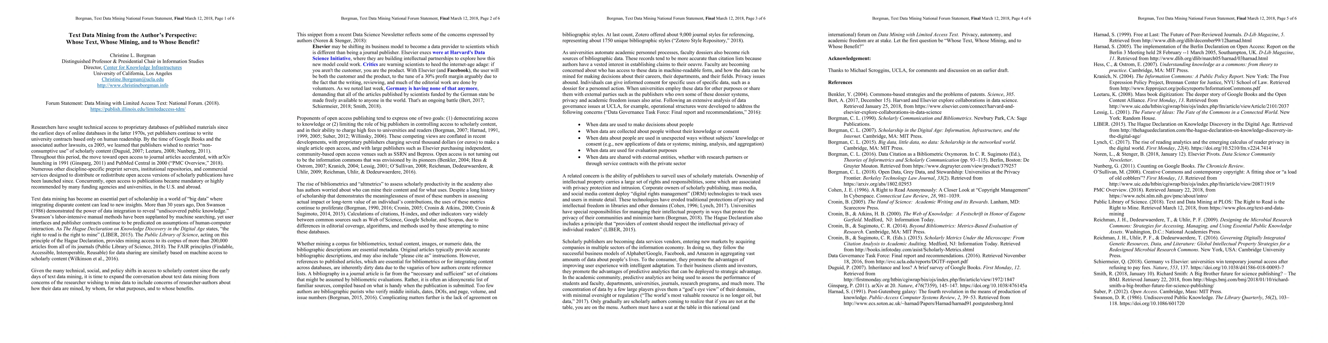 Given the many technical, social, and policy shifts in access to scholarly content since the early days of text data mining, it is time to expand the conversation about text data mining from concerns of the researcher wishing to mine data to include concerns of researcher-authors about how their data are mined, by whom, for what purposes, and to whose benefits.