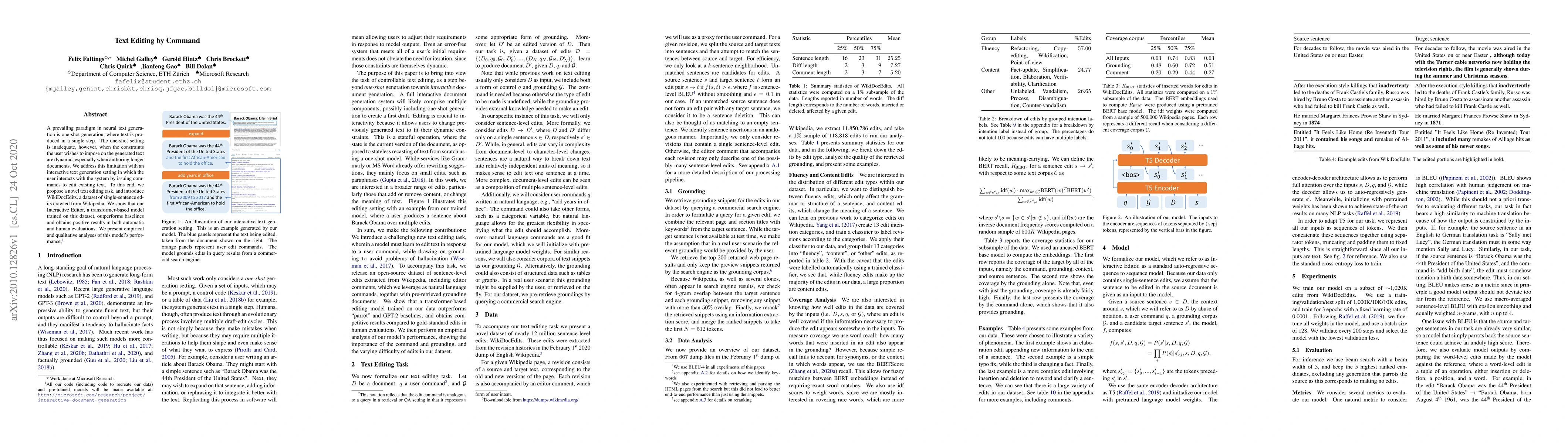 This research introduces an interactive text editing approach to overcome the limitations of one-shot generation in neural text models, especially for lengthy documents with dynamic constraints. The authors propose a novel text editing task, WikiDocEdits, a dataset of single-sentence Wikipedia edits, to train a transformer-based Interactive Editor model. The model demonstrates superior performance over baselines in both automatic and human evaluations, showcasing its effectiveness in interactive text generation scenarios.
