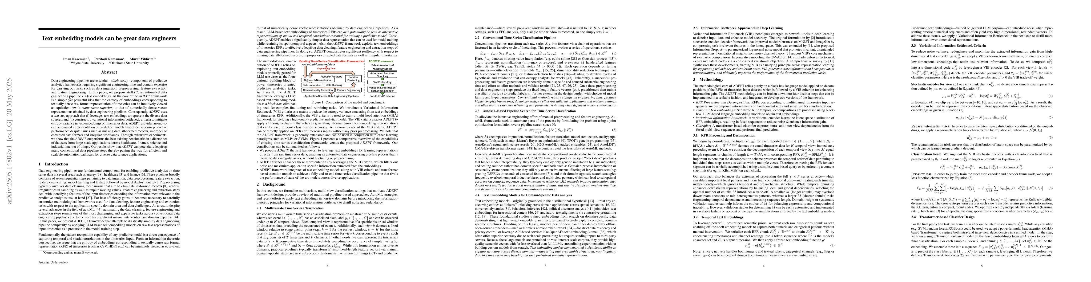 The paper proposes ADEPT, an automated data engineering pipeline using text embeddings, which involves representing diverse data sources with text embeddings and constructing a variational information bottleneck criteria to manage entropy variance in time series data text embeddings.