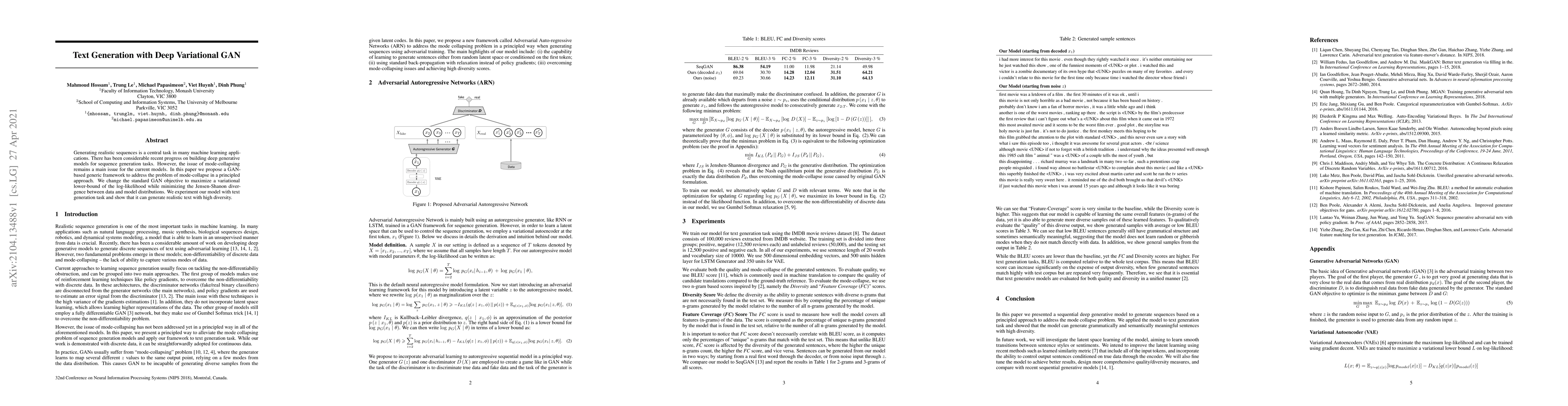 Researchers propose a new framework to address mode-collapsing in sequence generation tasks using a GAN-based approach that maximizes a variational lower-bound of log-likelihood while minimizing Jensen-Shannon divergence, resulting in realistic text with high diversity.