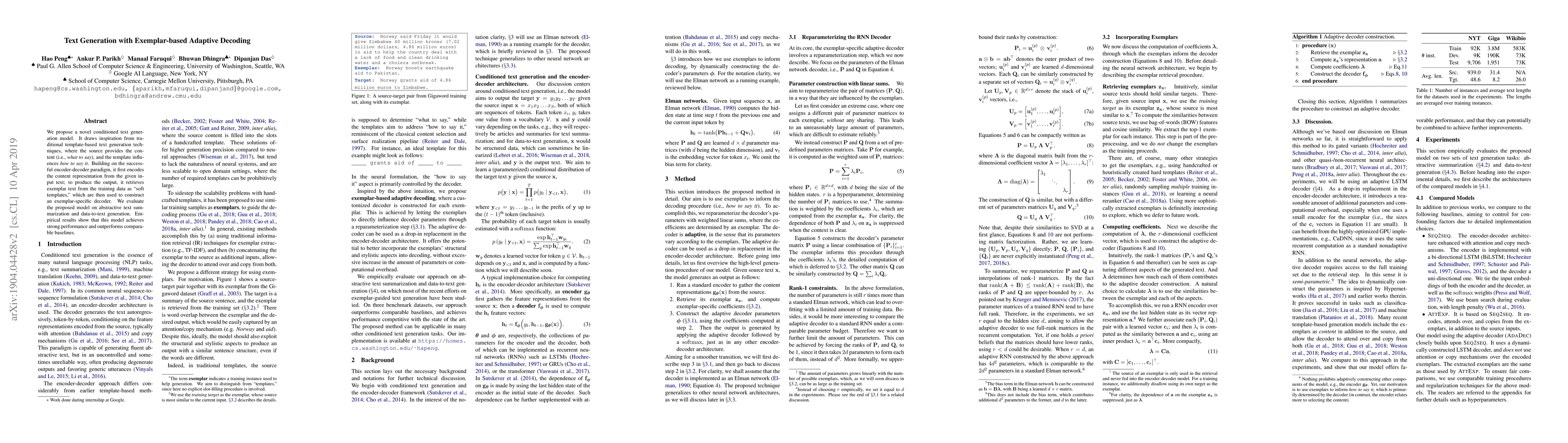 Researchers propose a novel text generation model inspired by template-based techniques, achieving strong performance in abstractive text summarization and data-to-text generation through adaptive decoding with exemplar text.