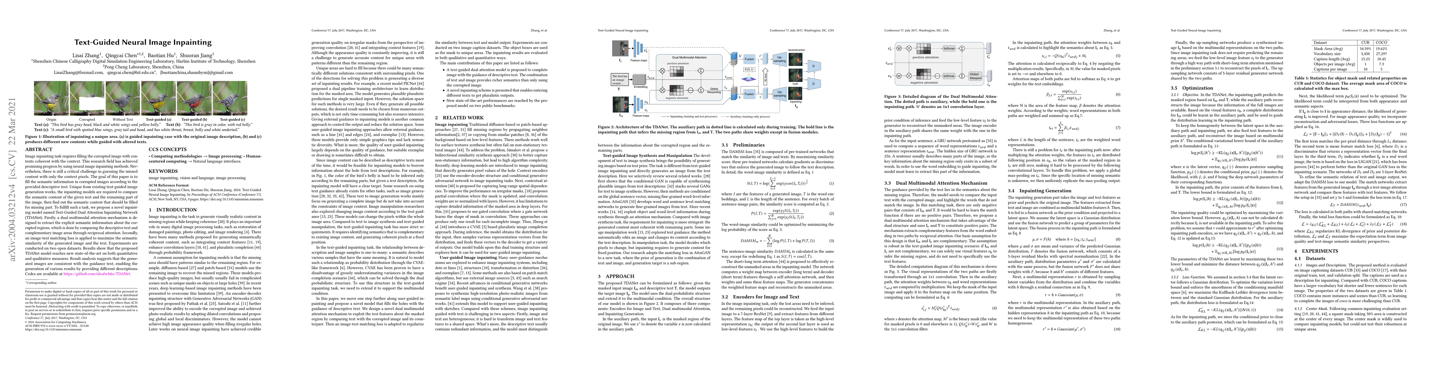 This paper proposes a Text-Guided Dual Attention Inpainting Network (TDANet) to fill in corrupted image regions by leveraging descriptive text. The model uses a dual attention mechanism to compare text and image context, and an image-text matching loss to ensure semantic consistency, achieving state-of-the-art results on two datasets.