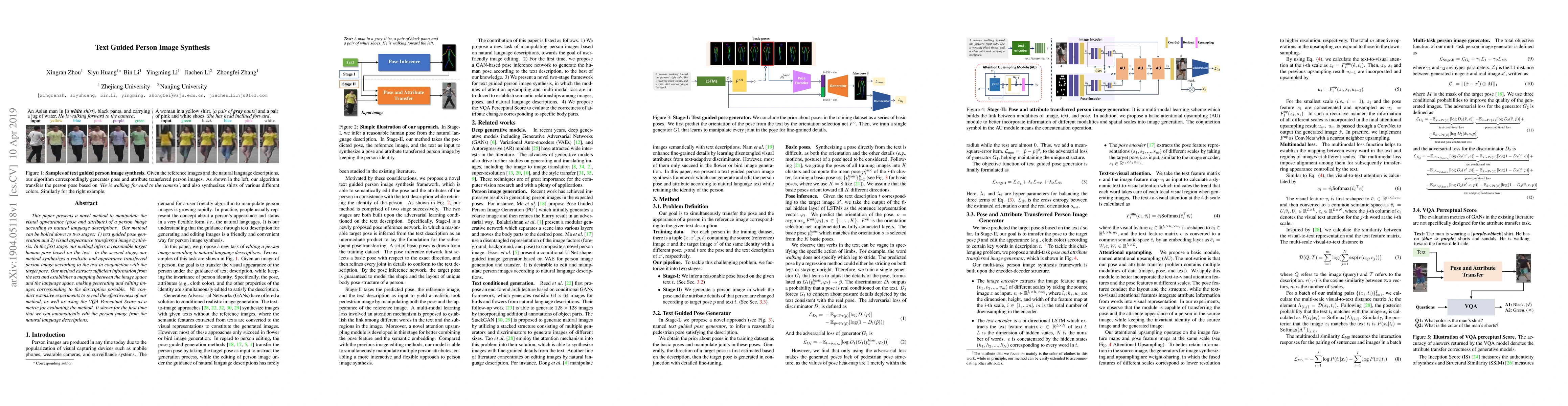 This paper introduces a method for synthesizing person images that reflect natural language descriptions, involving text-guided pose generation and visual appearance transfer. Experiments demonstrate the effectiveness of the method in automatically editing person images based on textual inputs.