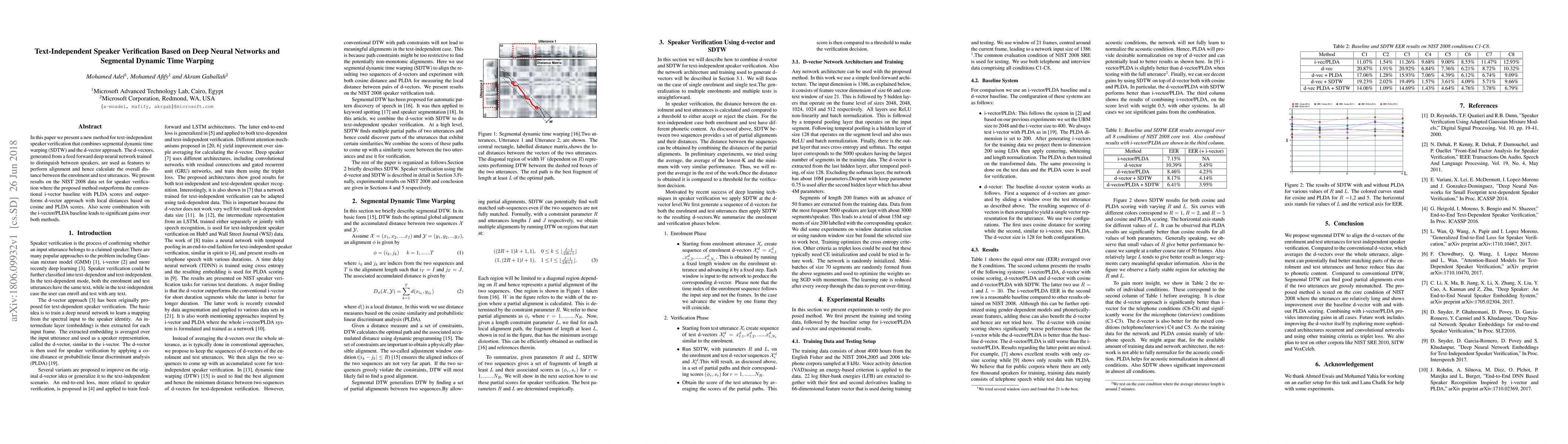 This paper introduces a text-independent speaker verification method combining segmental dynamic time warping (SDTW) with d-vectors from deep neural networks. The proposed method outperforms conventional i-vector baselines and the d-vector approach on the NIST 2008 dataset, with significant gains from score combination.