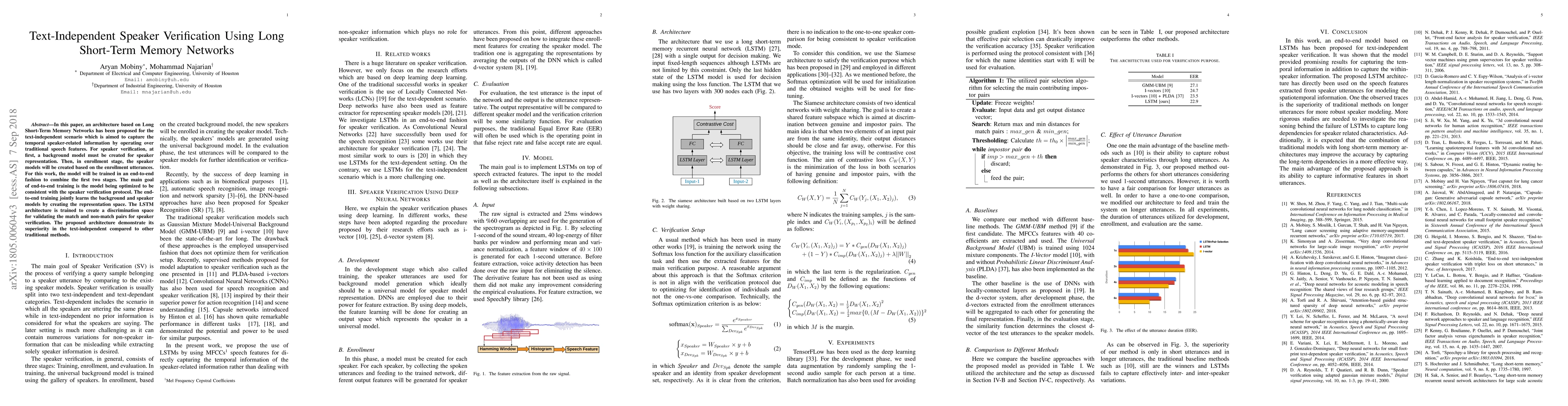 This paper proposes an LSTM-based architecture for text-independent speaker verification, optimizing both background and speaker models through end-to-end training. The LSTM network creates a discrimination space to distinguish between match and non-match pairs, outperforming traditional methods.