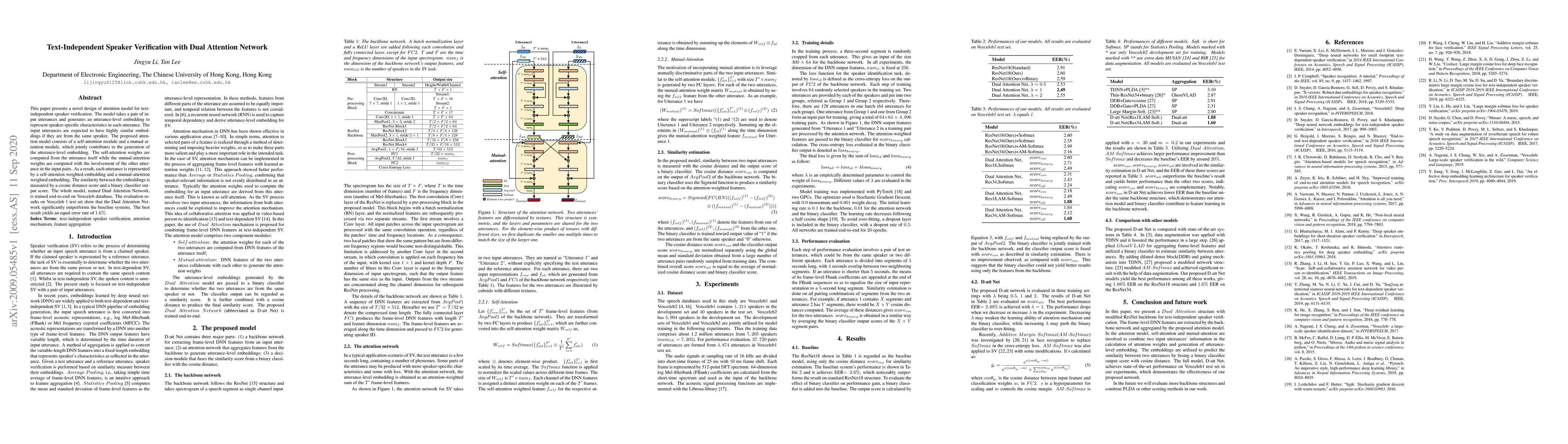 This paper introduces a Dual Attention Network for text-independent speaker verification using self- and mutual-attention modules to generate utterance-level embeddings, achieving a superior equal error rate of 1.6% on the Voxceleb 1 test set.
