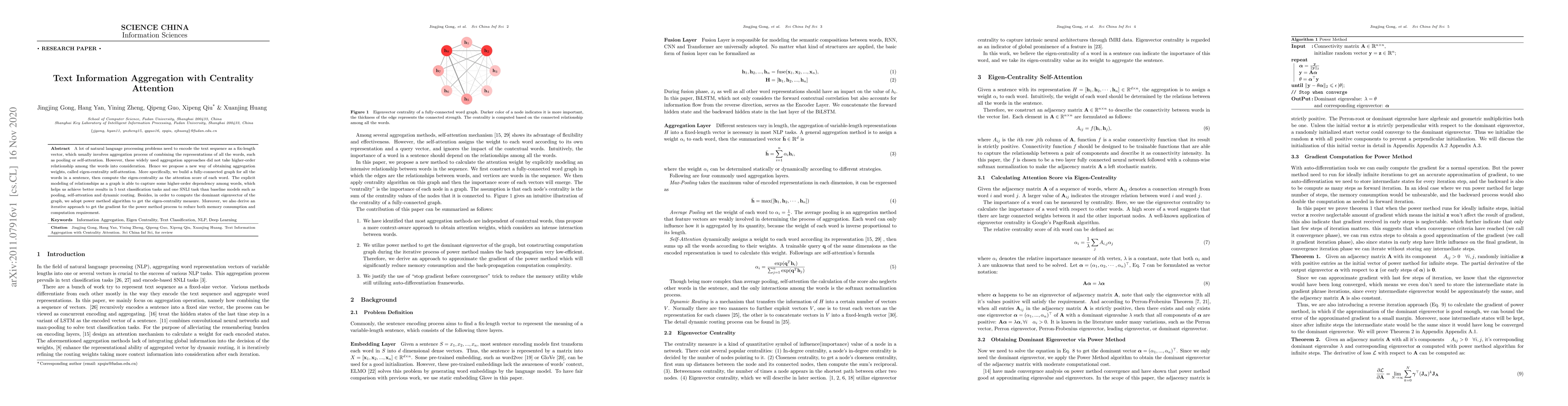 A lot of natural language processing problems need to encode the text sequence as a fix-length vector, which usually involves aggregation process of combining the representations of all the words, such as pooling or self-attention. However, these widely used aggregation approaches did not take higher-order relationship among the words into consideration. Hence we propose a new way of obtaining aggregation weights, called eigen-centrality self-attention. More specifically, we build a fully-connected graph for all the words in a sentence, then compute the eigen-centrality as the attention score of each word. The explicit modeling of relationships as a graph is able to capture some higher-order dependency among words, which helps us achieve better results in 5 text classification tasks and one SNLI task than baseline models such as pooling, self-attention and dynamic routing. Besides, in order to compute the dominant eigenvector of the graph, we adopt power method algorithm to get the eigen-centrality measure. Moreover, we also derive an iterative approach to get the gradient for the power method process to reduce both memory consumption and computation requirement.}