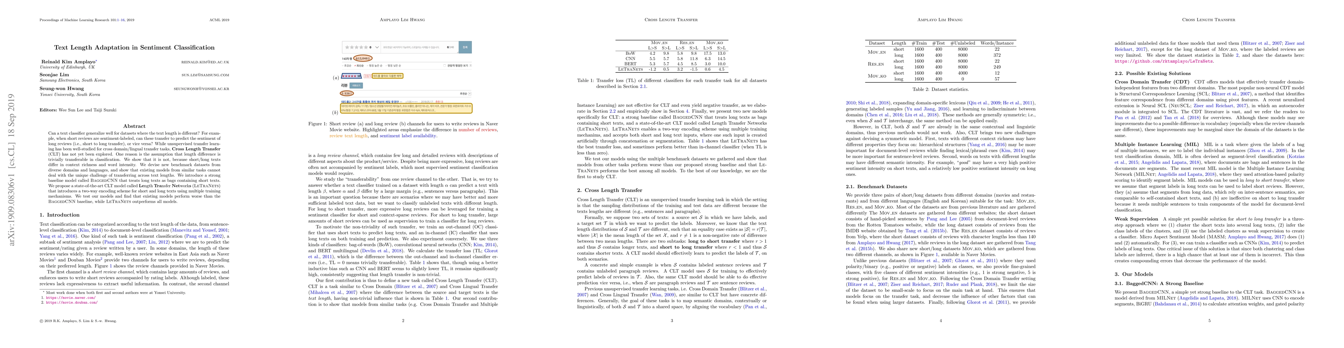 Can a text classifier generalize well for datasets where the text length is different? For example, when short reviews are sentiment-labeled, can these transfer to predict the sentiment of long reviews (i.e., short to long transfer), or vice versa? While unsupervised transfer learning has been well-studied for cross domain/lingual transfer tasks, Cross Length Transfer (CLT) has not yet been explored. One reason is the assumption that length difference is trivially transferable in classification. We show that it is not, because short/long texts differ in context richness and word intensity. We devise new benchmark datasets from diverse domains and languages, and show that existing models from similar tasks cannot deal with the unique challenge of transferring across text lengths. We introduce a strong baseline model called BaggedCNN that treats long texts as bags containing short texts. We propose a state-of-the-art CLT model called Length Transfer Networks (LeTraNets) that introduces a two-way encoding scheme for short and long texts using multiple training mechanisms. We test our models and find that existing models perform worse than the BaggedCNN baseline, while LeTraNets outperforms all models.