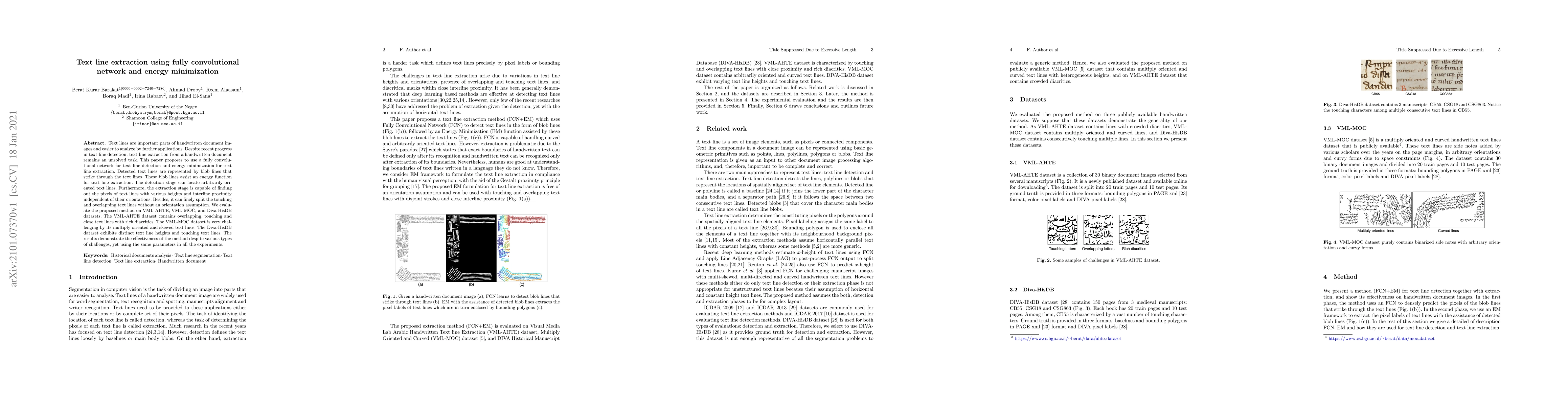 A new method uses a fully convolutional network for text line detection and energy minimization for extracting text lines from handwritten documents with high accuracy.