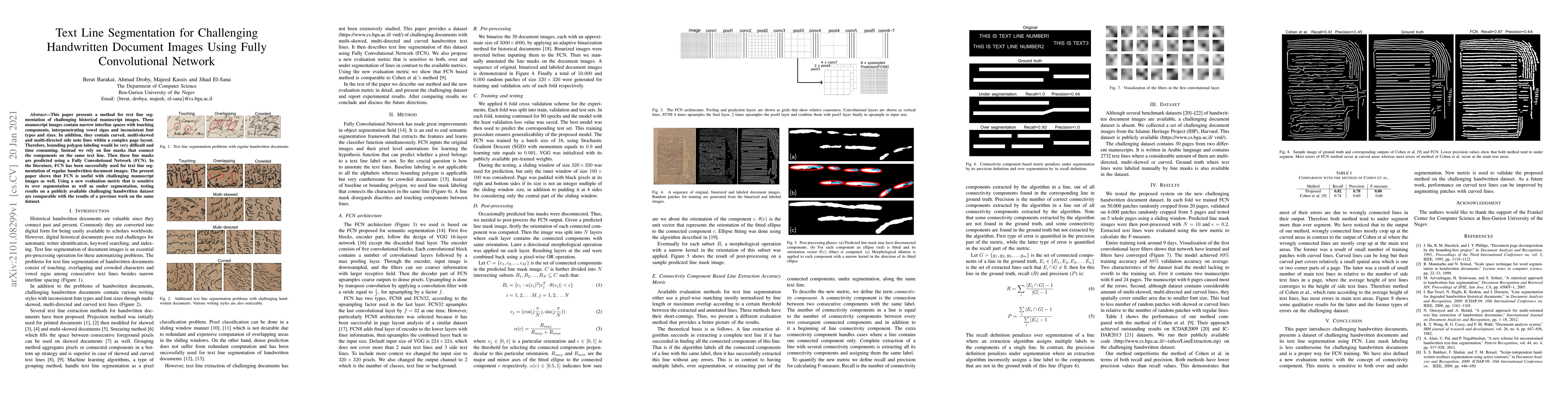 This paper introduces a method for text line segmentation in complex historical manuscripts using a Fully Convolutional Network (FCN) to predict line masks, demonstrating comparable results to previous methods on a challenging handwritten dataset. The FCN approach effectively handles narrow interline spaces, touching components, and inconsistent font types.