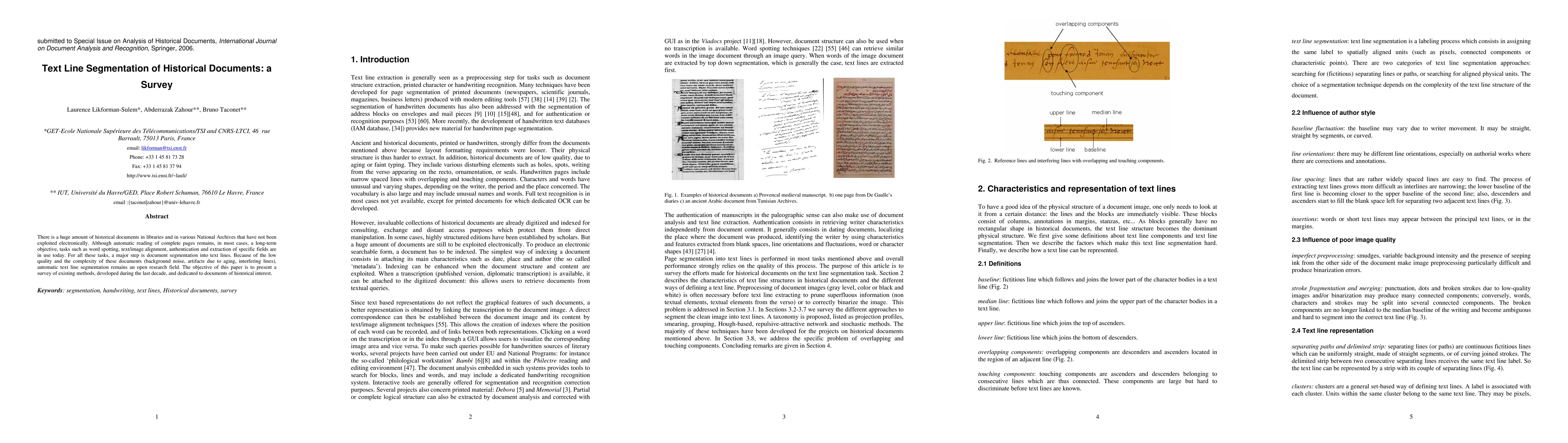 There is a huge amount of historical documents in libraries and in various National Archives that have not been exploited electronically. Although automatic reading of complete pages remains, in most cases, a long-term objective, tasks such as word spotting, text/image alignment, authentication and extraction of specific fields are in use today. For all these tasks, a major step is document segmentation into text lines. Because of the low quality and the complexity of these documents (background noise, artifacts due to aging, interfering lines),automatic text line segmentation remains an open research field. The objective of this paper is to present a survey of existing methods, developed during the last decade, and dedicated to documents of historical interest.