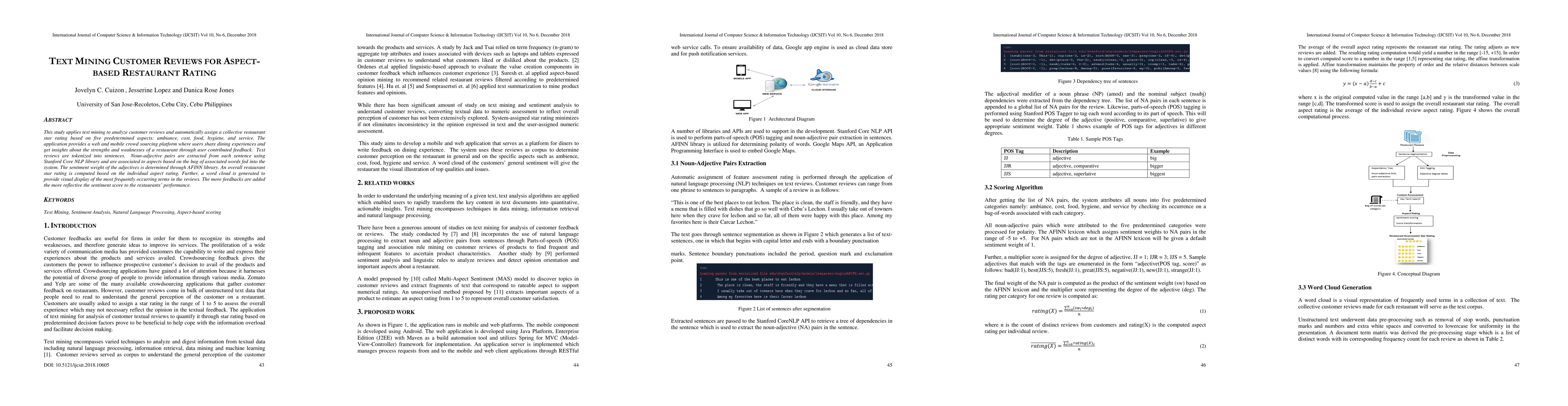 This study uses text mining to analyze customer reviews and assign star ratings to restaurants based on five aspects: ambiance, cost, food, hygiene, and service. It employs NLP tools to extract and evaluate sentiment from reviews, generating an overall rating and a word cloud for visual feedback insights.
