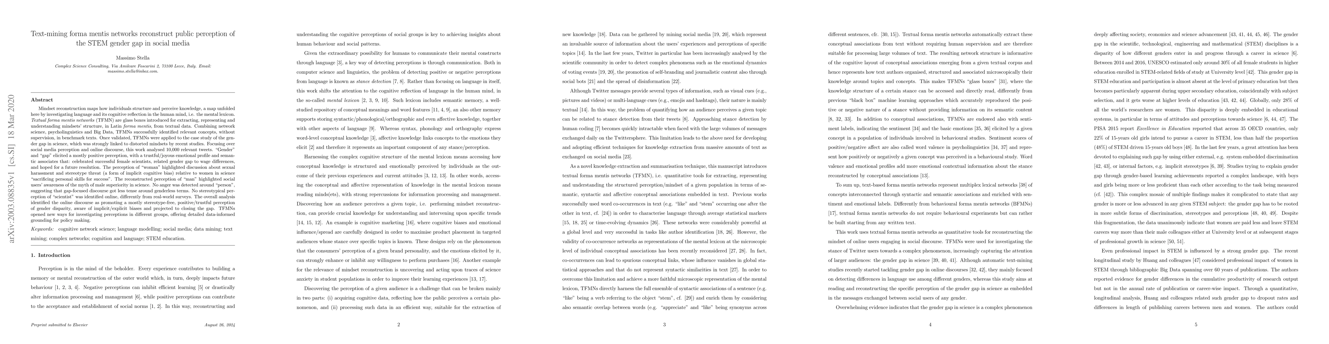 Mindset reconstruction maps how individuals structure and perceive knowledge, a map unfolded here by investigating language and its cognitive reflection in the human mind, i.e. the mental lexicon. Textual forma mentis networks (TFMN) are glass boxes introduced for extracting, representing and understanding mindsets' structure, in Latin "forma mentis", from textual data. Combining network science, psycholinguistics and Big Data, TFMNs successfully identified relevant concepts, without supervision, in benchmark texts. Once validated, TFMNs were applied to the case study of the gender gap in science, which was strongly linked to distorted mindsets by recent studies. Focusing over social media perception and online discourse, this work analysed 10,000 relevant tweets. "Gender" and "gap" elicited a mostly positive perception, with a trustful/joyous emotional profile and semantic associates that: celebrated successful female scientists, related gender gap to wage differences, and hoped for a future resolution. The perception of "woman" highlighted discussion about sexual harassment and stereotype threat (a form of implicit cognitive bias) relative to women in science "sacrificing personal skills for success". The reconstructed perception of "man" highlighted social users' awareness of the myth of male superiority in science. No anger was detected around "person", suggesting that gap-focused discourse got less tense around genderless terms. No stereotypical perception of "scientist" was identified online, differently from real-world surveys. The overall analysis identified the online discourse as promoting a mostly stereotype-free, positive/trustful perception of gender disparity, aware of implicit/explicit biases and projected to closing the gap. TFMNs opened new ways for investigating perceptions in different groups, offering detailed data-informed grounding for policy making.
