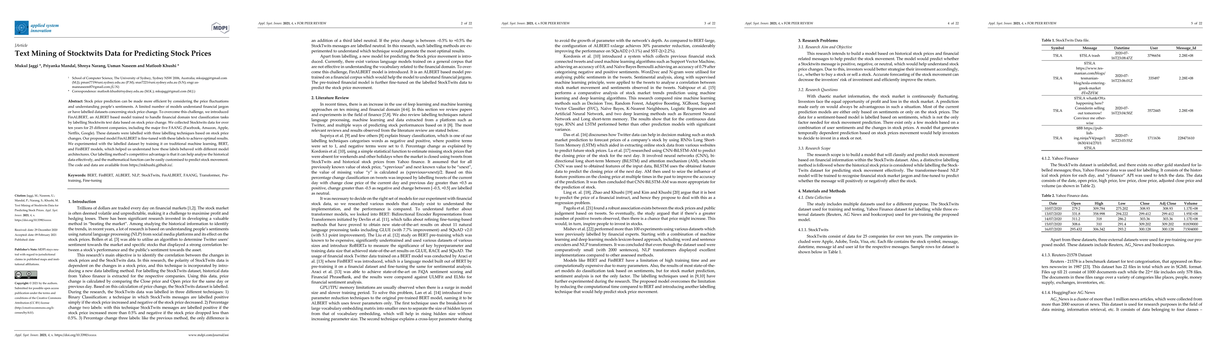 Stock price prediction can be made more efficient by considering the price fluctuations and understanding the sentiments of people. A limited number of models understand financial jargon or have labelled datasets concerning stock price change. To overcome this challenge, we introduced FinALBERT, an ALBERT based model trained to handle financial domain text classification tasks by labelling Stocktwits text data based on stock price change. We collected Stocktwits data for over ten years for 25 different companies, including the major five FAANG (Facebook, Amazon, Apple, Netflix, Google). These datasets were labelled with three labelling techniques based on stock price changes. Our proposed model FinALBERT is fine-tuned with these labels to achieve optimal results. We experimented with the labelled dataset by training it on traditional machine learning, BERT, and FinBERT models, which helped us understand how these labels behaved with different model architectures. Our labelling method competitive advantage is that it can help analyse the historical data effectively, and the mathematical function can be easily customised to predict stock movement.