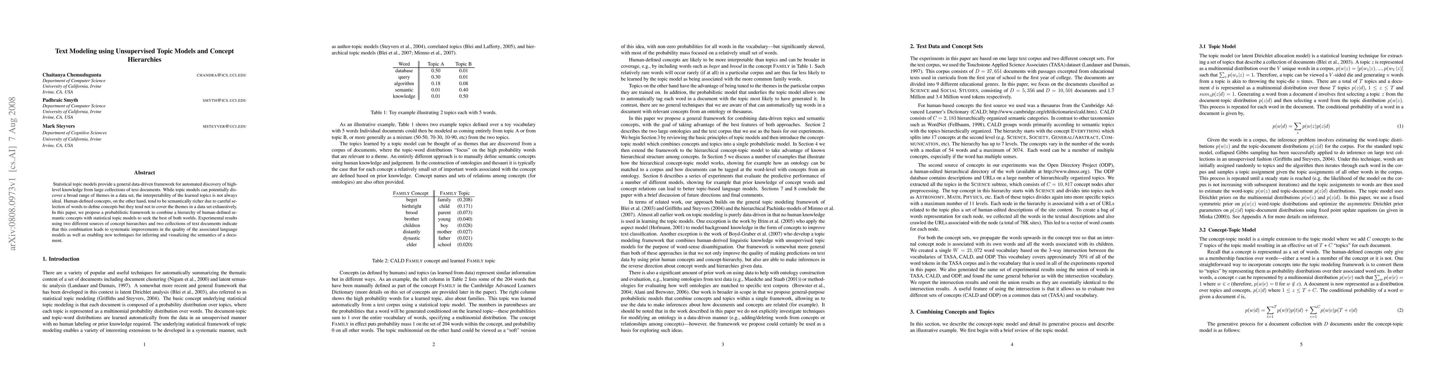This paper proposes a probabilistic framework combining unsupervised topic models with human-defined concept hierarchies to improve interpretability and coverage of discovered themes in text documents. Experimental results show enhanced language model quality and new semantic inference techniques.