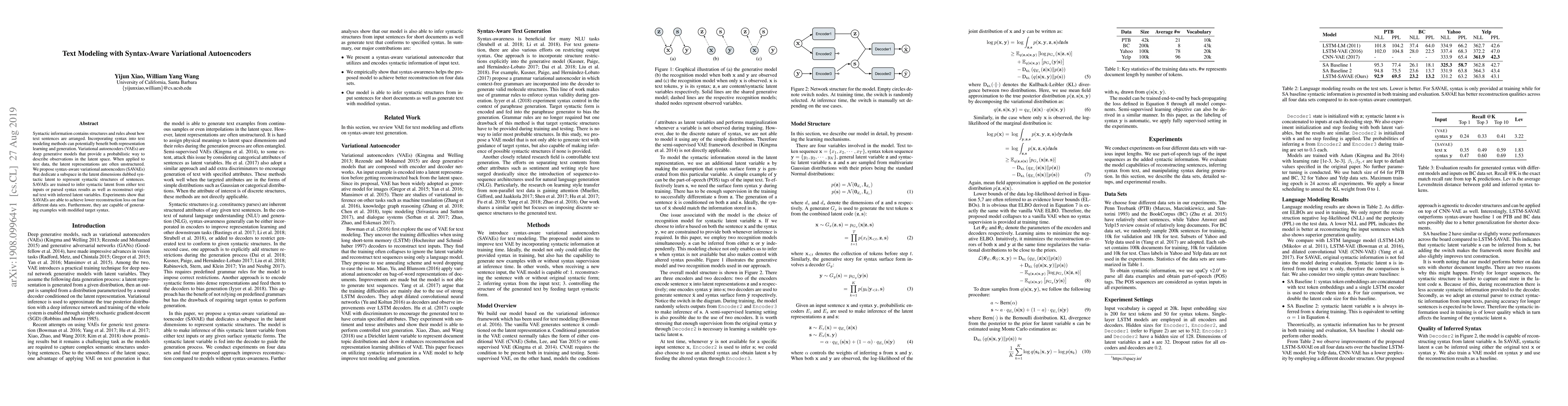 This paper proposes syntax-aware variational autoencoders (SAVAEs) to incorporate syntactic structures into text modeling, showing improved reconstruction and generation of text with modified syntax on multiple datasets.