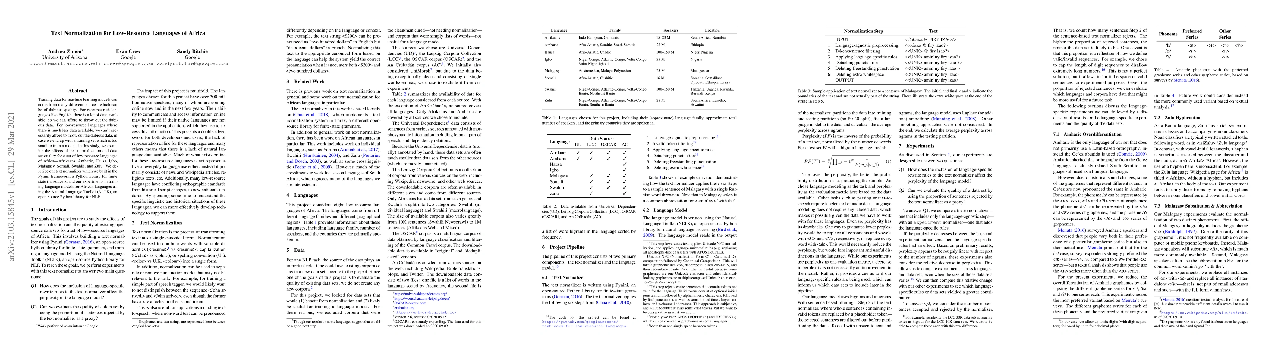 Training data for machine learning models can come from many different sources, which can be of dubious quality. For resource-rich languages like English, there is a lot of data available, so we can afford to throw out the dubious data. For low-resource languages where there is much less data available, we can't necessarily afford to throw out the dubious data, in case we end up with a training set which is too small to train a model. In this study, we examine the effects of text normalization and data set quality for a set of low-resource languages of Africa -- Afrikaans, Amharic, Hausa, Igbo, Malagasy, Somali, Swahili, and Zulu. We describe our text normalizer which we built in the Pynini framework, a Python library for finite state transducers, and our experiments in training language models for African languages using the Natural Language Toolkit (NLTK), an open-source Python library for NLP.