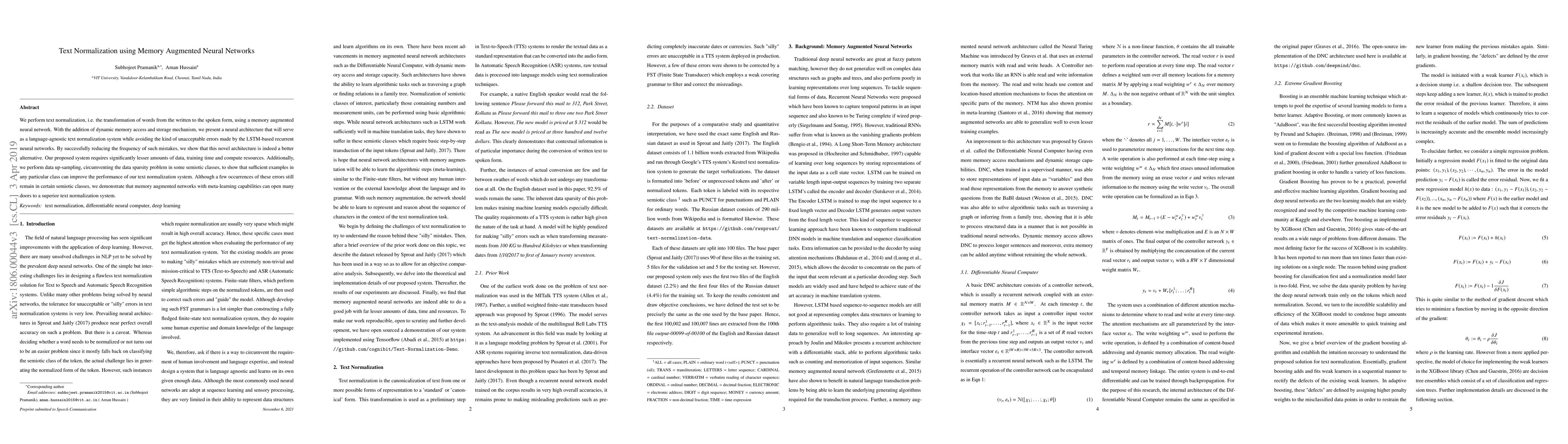 We perform text normalization, i.e. the transformation of words from the written to the spoken form, using a memory augmented neural network. With the addition of dynamic memory access and storage mechanism, we present a neural architecture that will serve as a language-agnostic text normalization system while avoiding the kind of unacceptable errors made by the LSTM-based recurrent neural networks. By successfully reducing the frequency of such mistakes, we show that this novel architecture is indeed a better alternative. Our proposed system requires significantly lesser amounts of data, training time and compute resources. Additionally, we perform data up-sampling, circumventing the data sparsity problem in some semiotic classes, to show that sufficient examples in any particular class can improve the performance of our text normalization system. Although a few occurrences of these errors still remain in certain semiotic classes, we demonstrate that memory augmented networks with meta-learning capabilities can open many doors to a superior text normalization system.
