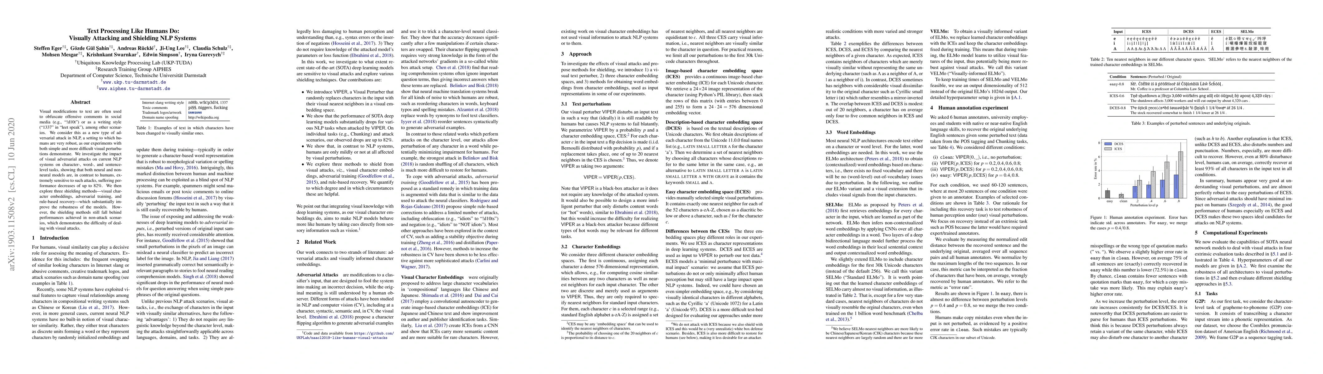 The paper explores a novel form of adversarial attack on NLP systems using visual text modifications, to which humans are robust. It shows that current NLP models, both neural and non-neural, are highly sensitive to these attacks, suffering performance drops of up to 82%. Three shielding methods are proposed - visual character embeddings, adversarial training, and rule-based recovery - which enhance model robustness, though not fully restoring non-attack performance levels, highlighting the challenge of countering such visual attacks.