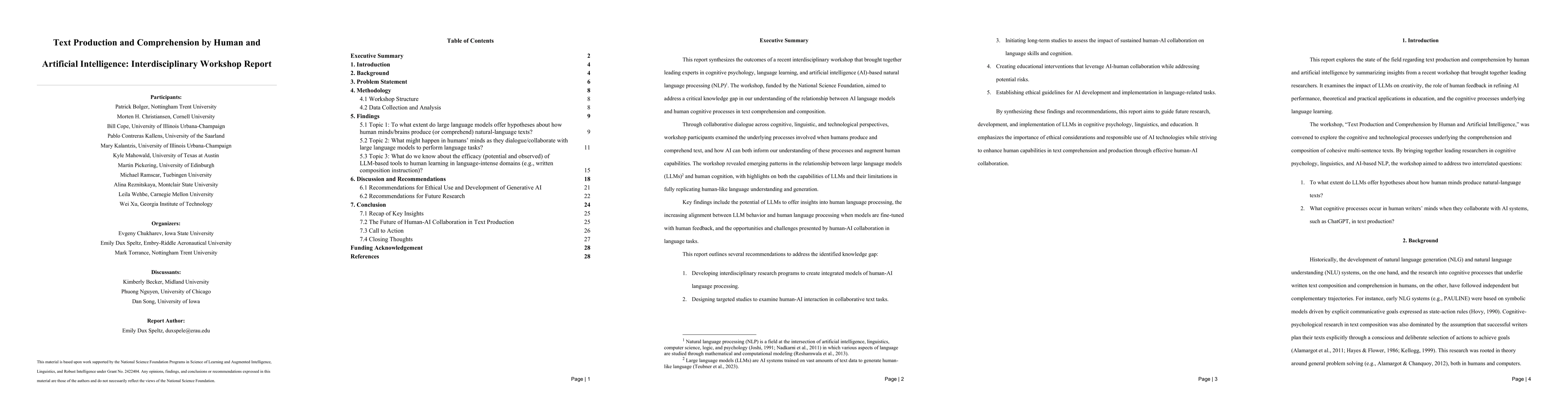 This report synthesizes the outcomes of a recent interdisciplinary workshop that brought together leading experts in cognitive psychology, language learning, and artificial intelligence (AI)-based natural language processing (NLP). The workshop, funded by the National Science Foundation, aimed to address a critical knowledge gap in our understanding of the relationship between AI language models and human cognitive processes in text comprehension and composition. Through collaborative dialogue across cognitive, linguistic, and technological perspectives, workshop participants examined the underlying processes involved when humans produce and comprehend text, and how AI can both inform our understanding of these processes and augment human capabilities. The workshop revealed emerging patterns in the relationship between large language models (LLMs) and human cognition, with highlights on both the capabilities of LLMs and their limitations in fully replicating human-like language understanding and generation. Key findings include the potential of LLMs to offer insights into human language processing, the increasing alignment between LLM behavior and human language processing when models are fine-tuned with human feedback, and the opportunities and challenges presented by human-AI collaboration in language tasks. By synthesizing these findings, this report aims to guide future research, development, and implementation of LLMs in cognitive psychology, linguistics, and education. It emphasizes the importance of ethical considerations and responsible use of AI technologies while striving to enhance human capabilities in text comprehension and production through effective human-AI collaboration.