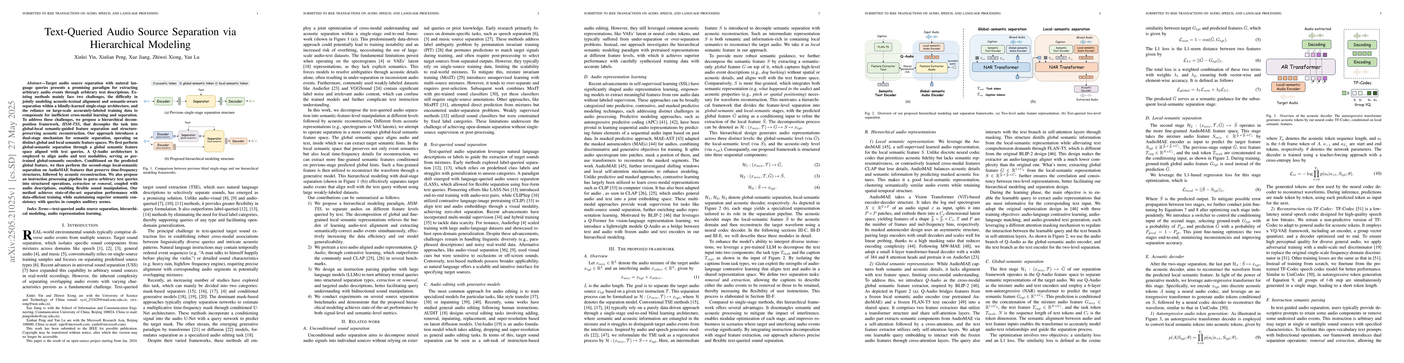 This work stands out by proposing a hierarchical approach that decouples the audio source separation task into global-local semantic feature separation and structure-preserving acoustic reconstruction, enabling data-efficient training and superior semantic consistency.