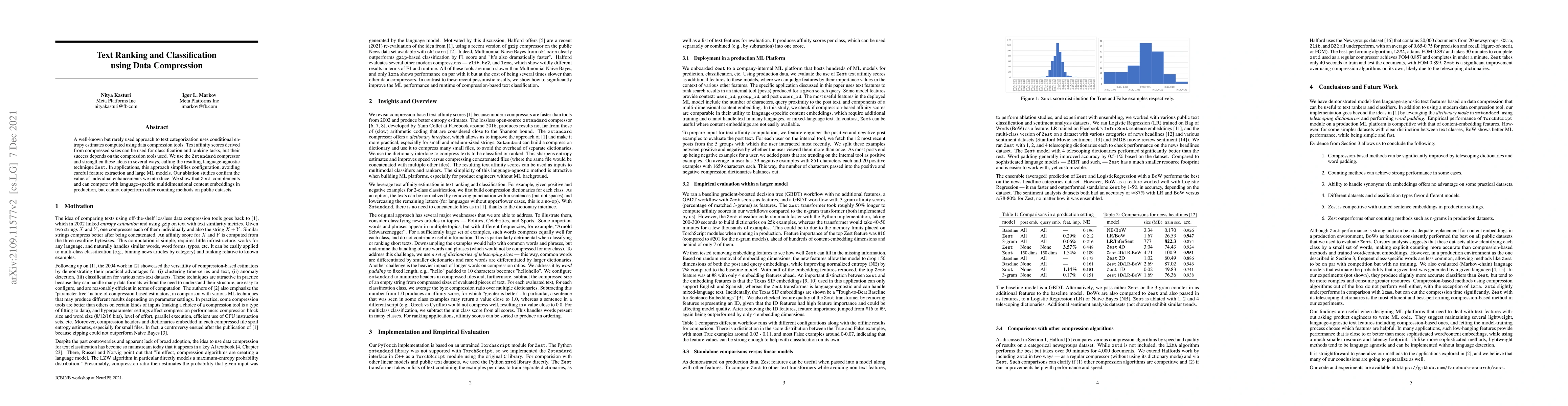 This paper introduces Zest, a language-agnostic text ranking and classification technique based on conditional entropy estimates from data compression, specifically using the Zstandard compressor. While Zest simplifies configuration and avoids complex ML models, it shows competitive performance in production but cannot outperform other counting methods on public datasets.