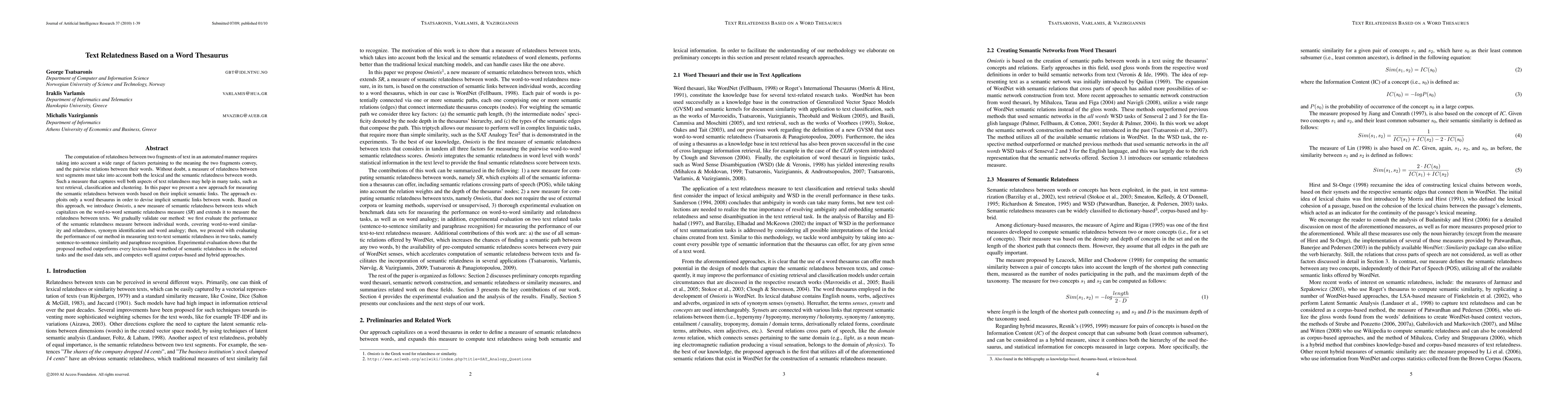 This paper introduces a new method for measuring semantic relatedness between text fragments using a word thesaurus to establish implicit semantic links between words. The proposed measure, Omiotis, outperforms lexicon-based methods and competes well with corpus-based and hybrid approaches in tasks like sentence similarity and paraphrase recognition.