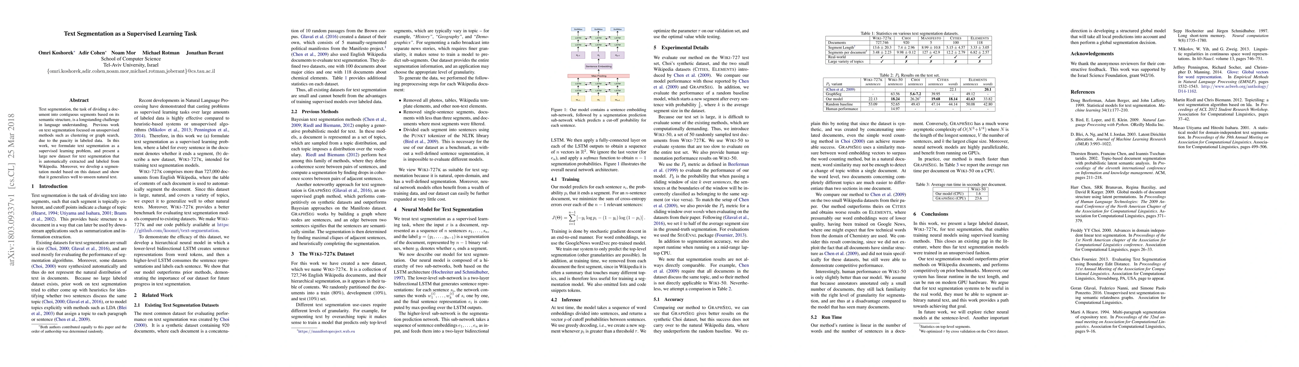 Text segmentation, the task of dividing a document into contiguous segments based on its semantic structure, is a longstanding challenge in language understanding. Previous work on text segmentation focused on unsupervised methods such as clustering or graph search, due to the paucity in labeled data. In this work, we formulate text segmentation as a supervised learning problem, and present a large new dataset for text segmentation that is automatically extracted and labeled from Wikipedia. Moreover, we develop a segmentation model based on this dataset and show that it generalizes well to unseen natural text.