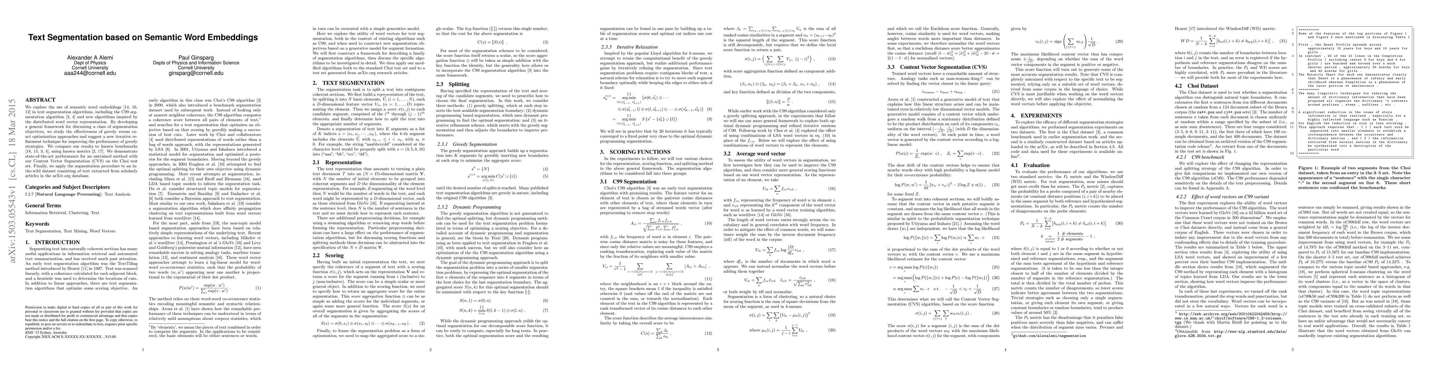 This paper investigates the application of semantic word embeddings in text segmentation, proposing new algorithms and an iterative refinement technique to enhance performance. The Content Vector Segmentation (CVS) method achieves state-of-the-art results on the Choi test set and is applied to text from scholarly articles in the arXiv.org database.