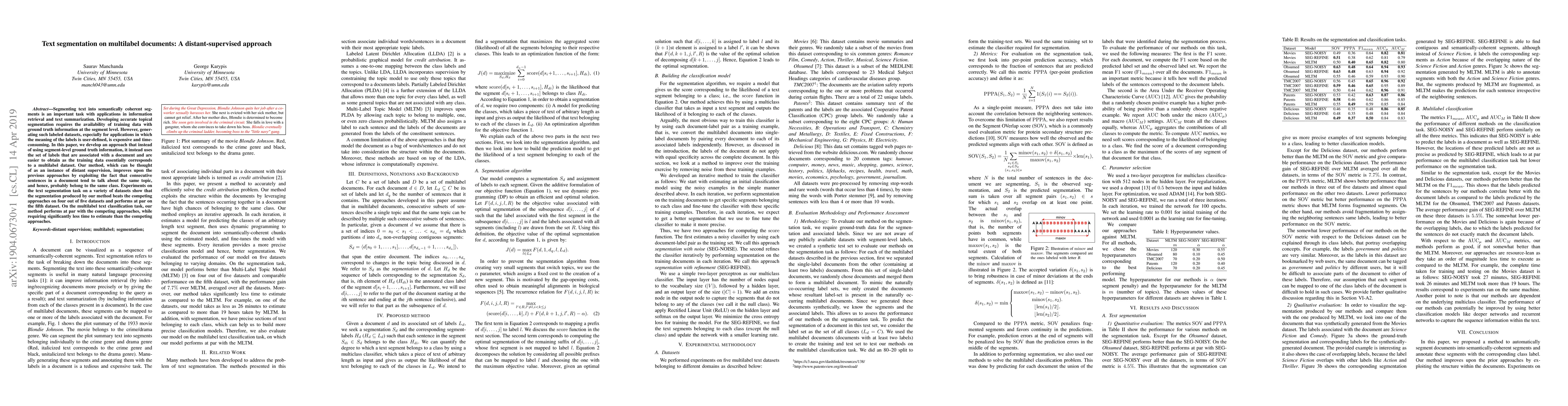 Segmenting text into semantically coherent segments is an important task with applications in information retrieval and text summarization. Developing accurate topical segmentation requires the availability of training data with ground truth information at the segment level. However, generating such labeled datasets, especially for applications in which the meaning of the labels is user-defined, is expensive and time-consuming. In this paper, we develop an approach that instead of using segment-level ground truth information, it instead uses the set of labels that are associated with a document and are easier to obtain as the training data essentially corresponds to a multilabel dataset. Our method, which can be thought of as an instance of distant supervision, improves upon the previous approaches by exploiting the fact that consecutive sentences in a document tend to talk about the same topic, and hence, probably belong to the same class. Experiments on the text segmentation task on a variety of datasets show that the segmentation produced by our method beats the competing approaches on four out of five datasets and performs at par on the fifth dataset. On the multilabel text classification task, our method performs at par with the competing approaches, while requiring significantly less time to estimate than the competing approaches.