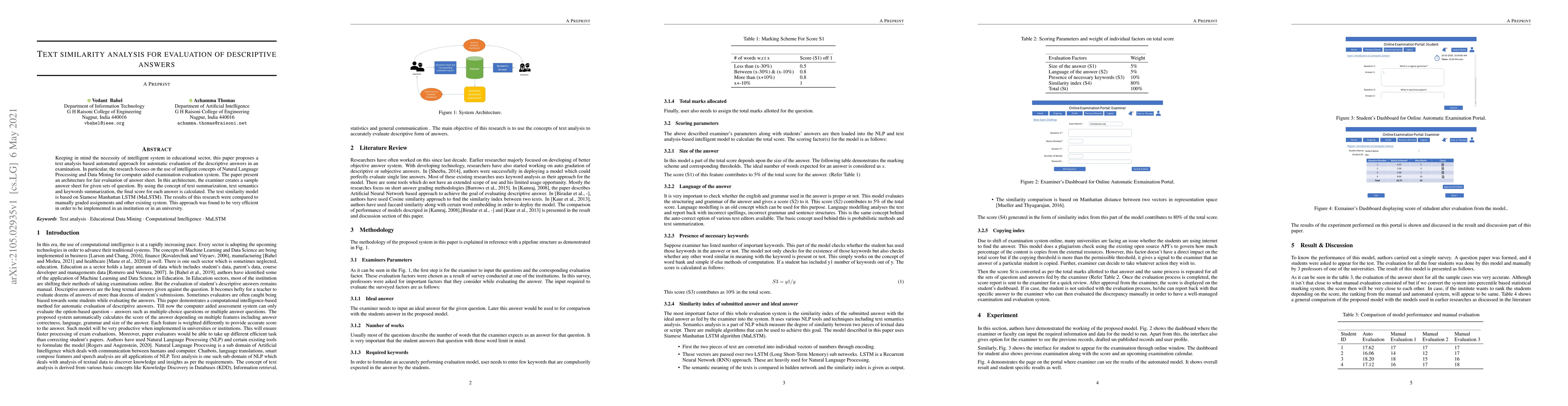 This paper proposes an automated system for evaluating descriptive answers using text analysis, NLP, and Data Mining. The system employs a Siamese Manhattan LSTM model to assess text similarity, comparing it to manually graded answers and existing systems, and demonstrating its efficiency for institutional use.