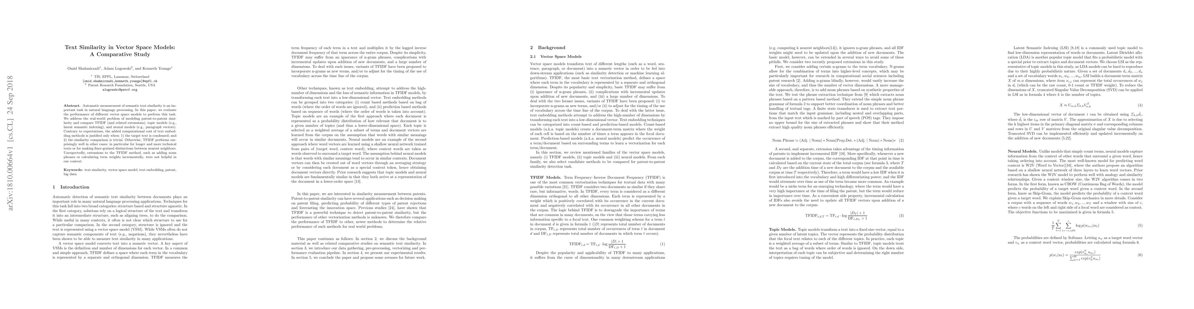 Automatic measurement of semantic text similarity is an important task in natural language processing. In this paper, we evaluate the performance of different vector space models to perform this task. We address the real-world problem of modeling patent-to-patent similarity and compare TFIDF (and related extensions), topic models (e.g., latent semantic indexing), and neural models (e.g., paragraph vectors). Contrary to expectations, the added computational cost of text embedding methods is justified only when: 1) the target text is condensed; and 2) the similarity comparison is trivial. Otherwise, TFIDF performs surprisingly well in other cases: in particular for longer and more technical texts or for making finer-grained distinctions between nearest neighbors. Unexpectedly, extensions to the TFIDF method, such as adding noun phrases or calculating term weights incrementally, were not helpful in our context.
