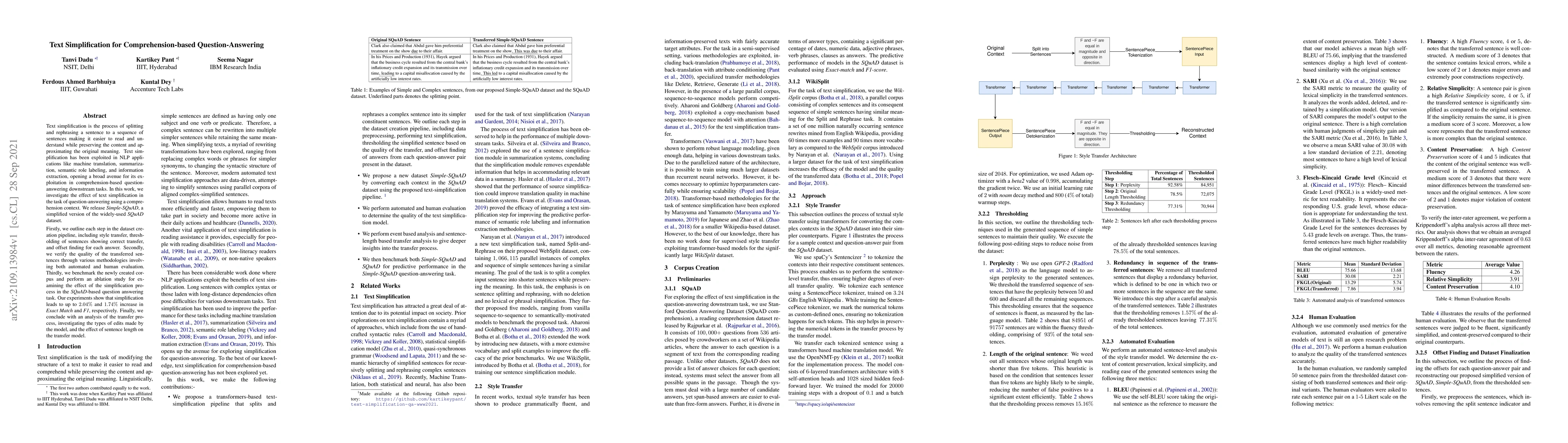 Text simplification is the process of splitting and rephrasing a sentence to a sequence of sentences making it easier to read and understand while preserving the content and approximating the original meaning. Text simplification has been exploited in NLP applications like machine translation, summarization, semantic role labeling, and information extraction, opening a broad avenue for its exploitation in comprehension-based question-answering downstream tasks. In this work, we investigate the effect of text simplification in the task of question-answering using a comprehension context. We release Simple-SQuAD, a simplified version of the widely-used SQuAD dataset. Firstly, we outline each step in the dataset creation pipeline, including style transfer, thresholding of sentences showing correct transfer, and offset finding for each answer. Secondly, we verify the quality of the transferred sentences through various methodologies involving both automated and human evaluation. Thirdly, we benchmark the newly created corpus and perform an ablation study for examining the effect of the simplification process in the SQuAD-based question answering task. Our experiments show that simplification leads to up to 2.04% and 1.74% increase in Exact Match and F1, respectively. Finally, we conclude with an analysis of the transfer process, investigating the types of edits made by the model, and the effect of sentence length on the transfer model.